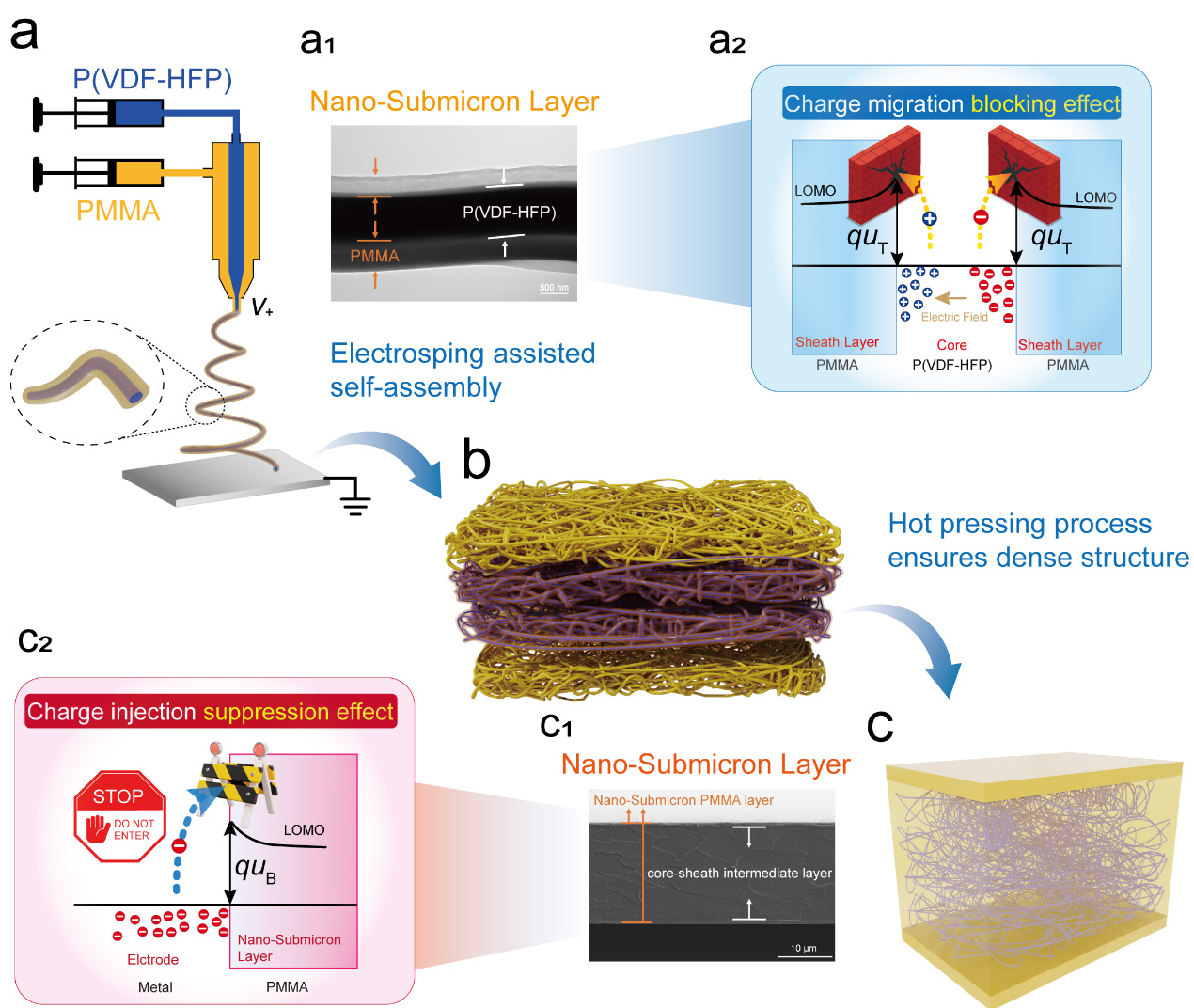 本研究采用静电纺丝技术,成功制备了一种多层全有机复合电介质薄膜,其表层为PMMA纳米-亚微米纤维,中间层为P(VDF-HFP)@PMMA芯-鞘结构纤维,经热压处理后形成致密的薄膜。该薄膜在储能密度与充放电效率方面实现了协同优化。薄膜介电性能的显著提升主要归因于以下两个关键机制:一是基于Poole-Frenkel效应的电子迁移限制。在P(VDF-HFP)@PMMA芯-鞘结构中,纳米-亚微米级鞘层PMMA,显著限制了电子的迁移和跳跃传导。这一结构设计有效抑制了电子的自由移动,从而显著提高了电介质的击穿强度。二是基于Schottky效应的界面调控。在电极与电介质的界面处,纳米-亚微米级PMMA表层有效阻止了电子从电极注入电介质内部。这种界面工程策略不仅进一步提升了电介质的击穿强度,还显著提高了充放电效率。