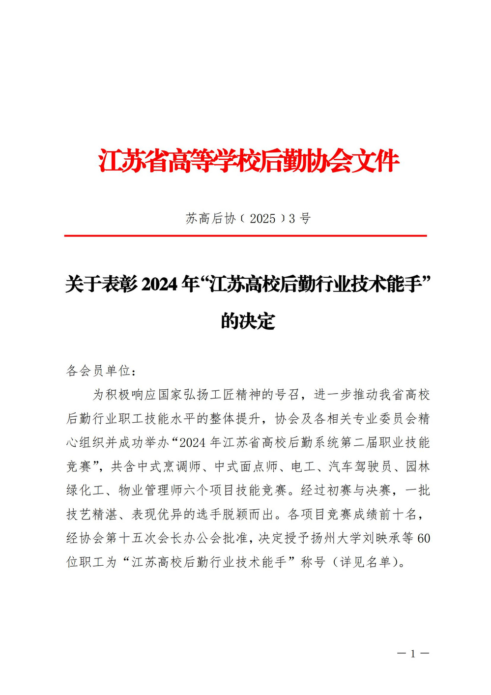 秦中宝荣获“2024年江苏高校后勤行业技术能手”荣誉称号