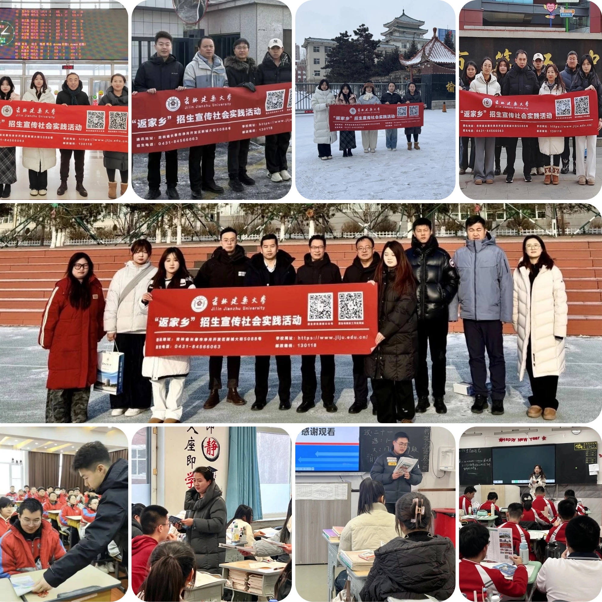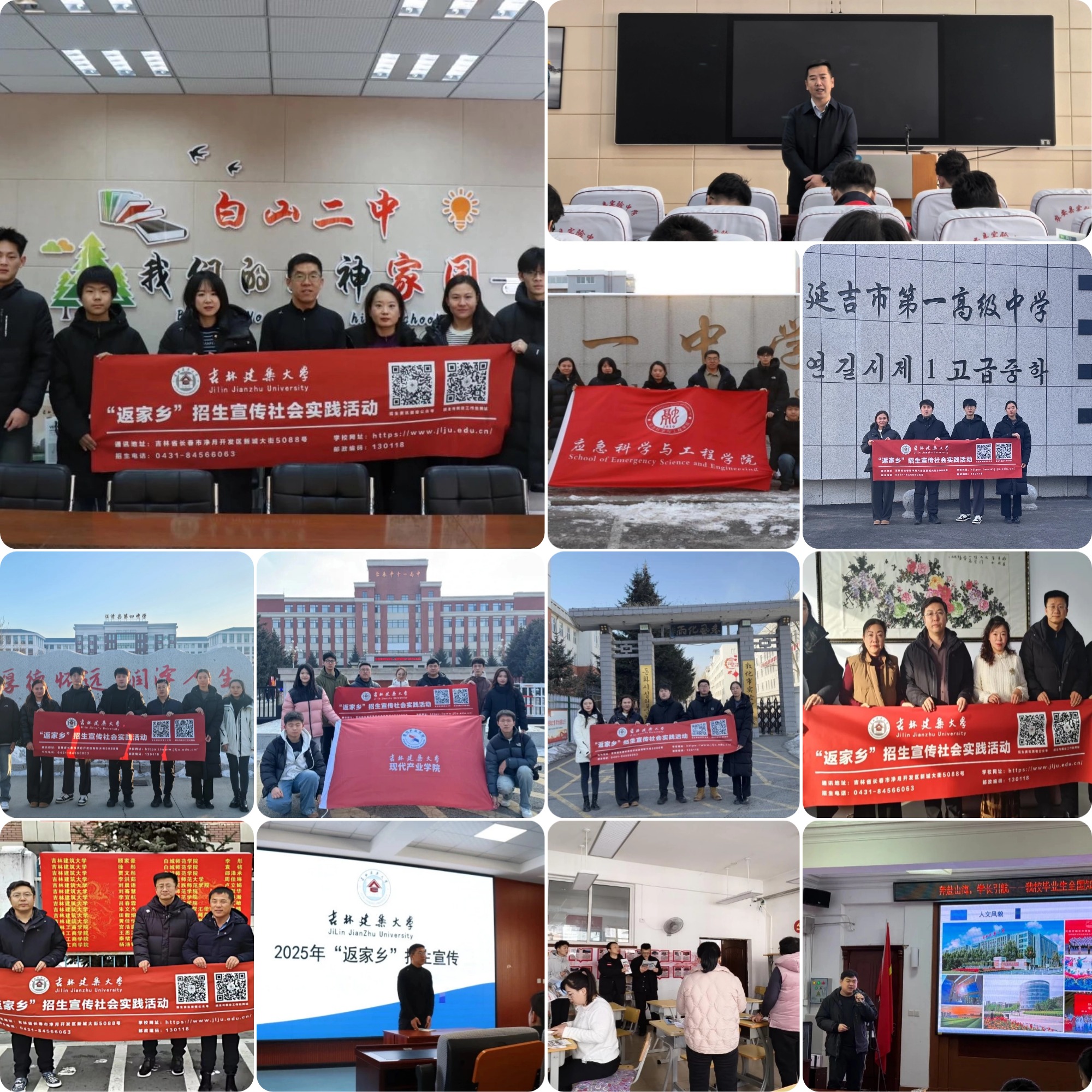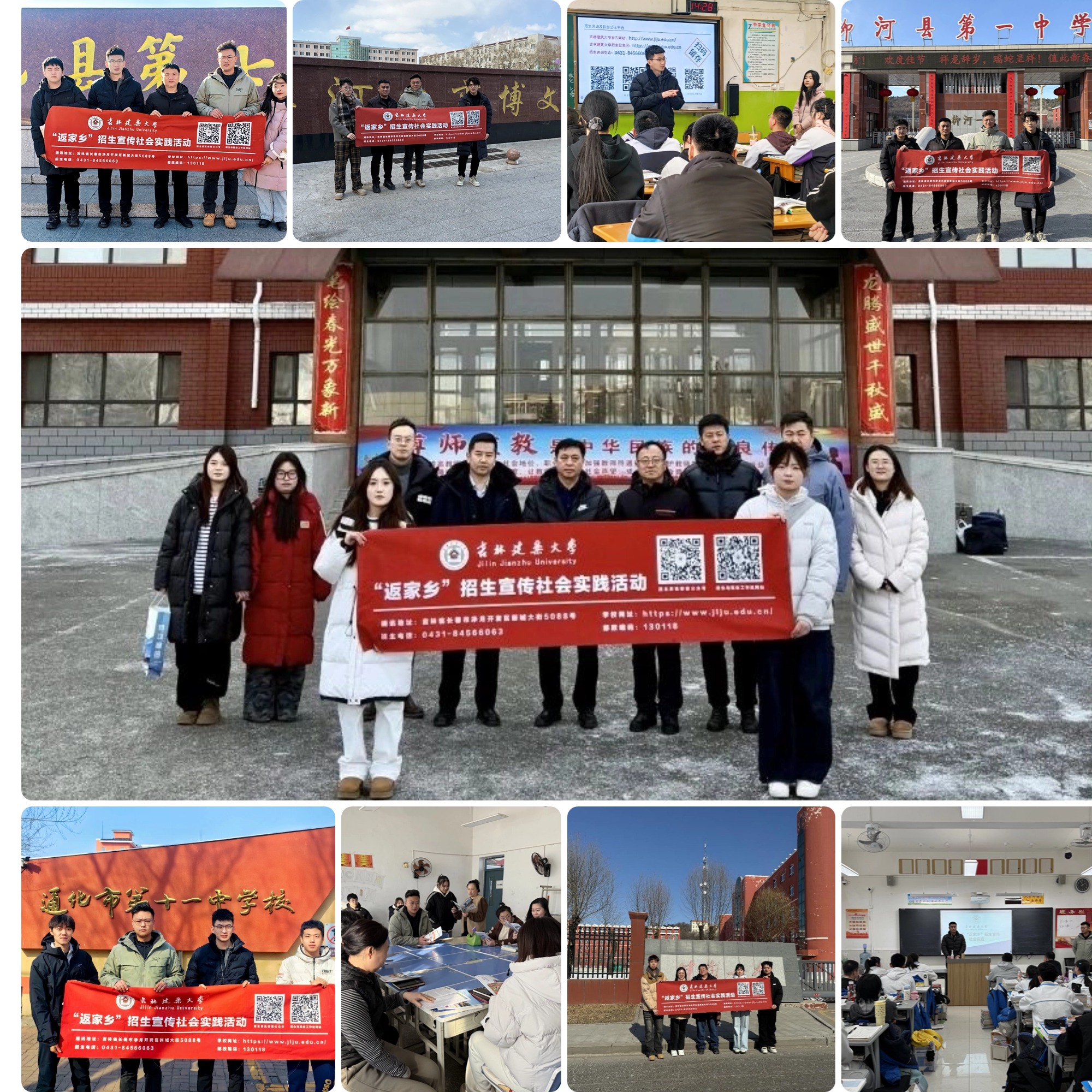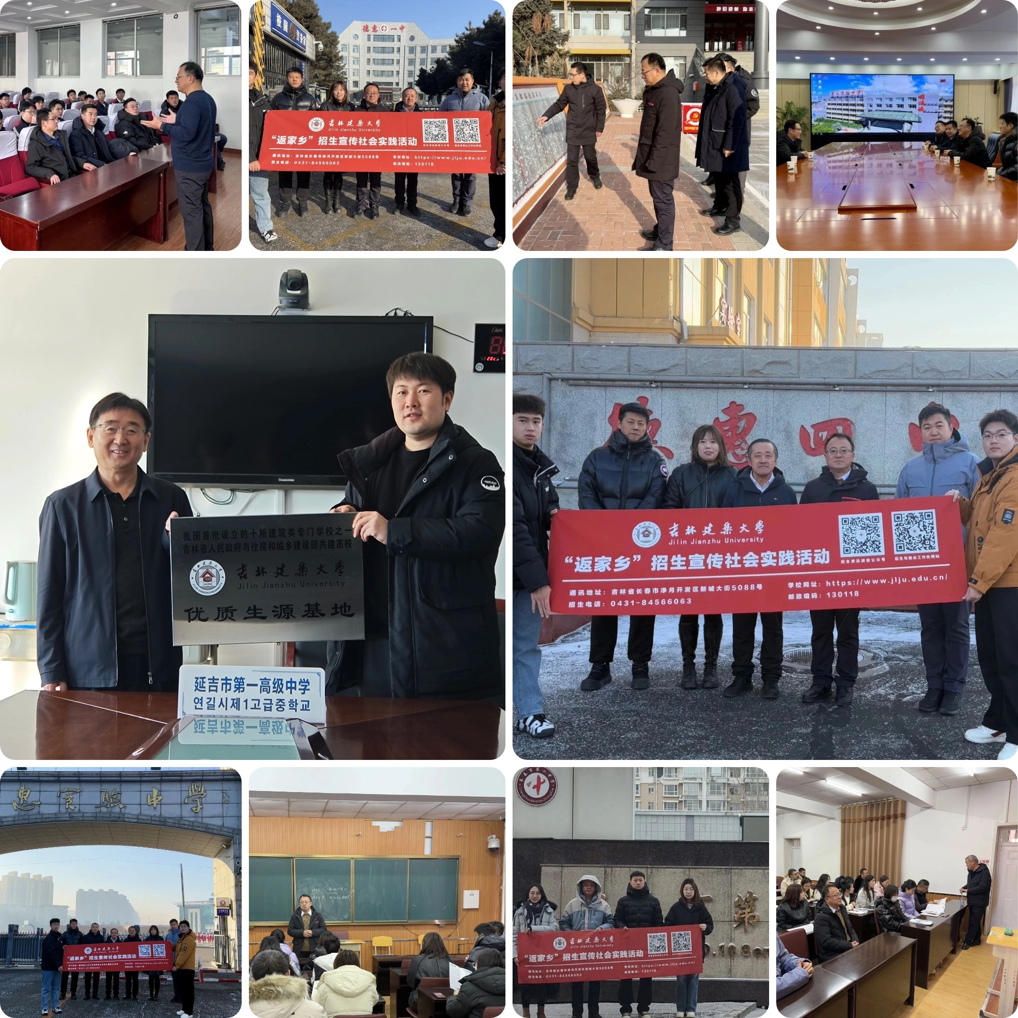 寒假期间,各学院招生宣传团队分别赴长春市十一高中、吉林省实验高中、长春市第五中学、白山市第一中学、临江市第一中学、通化县第七中学、梅河口市第五中学、柳河县第一中学、辉南县第六中学、延吉市第一中学、敦化市实验中学、农安县实验中学、榆树市实验高级中学、德惠市实验中学等30余所高中开展招生宣传社会实践工作。各团队深入高三班级进行招生宣传宣讲、发放宣传材料、播放宣传影片等。同时,与相关负责人深入交流了学校近年来招生数量、招生情况、优势专业学科设置、人才培养模式、学校就业质量情况等。各团队成员向各高中相关负责人及各地区师生发出邀请,希望广大高三学子能够了解吉建、选择吉建、爱上吉建,踊跃报考吉林建筑大学,做国家城乡基本建设领域的时代筑梦人。