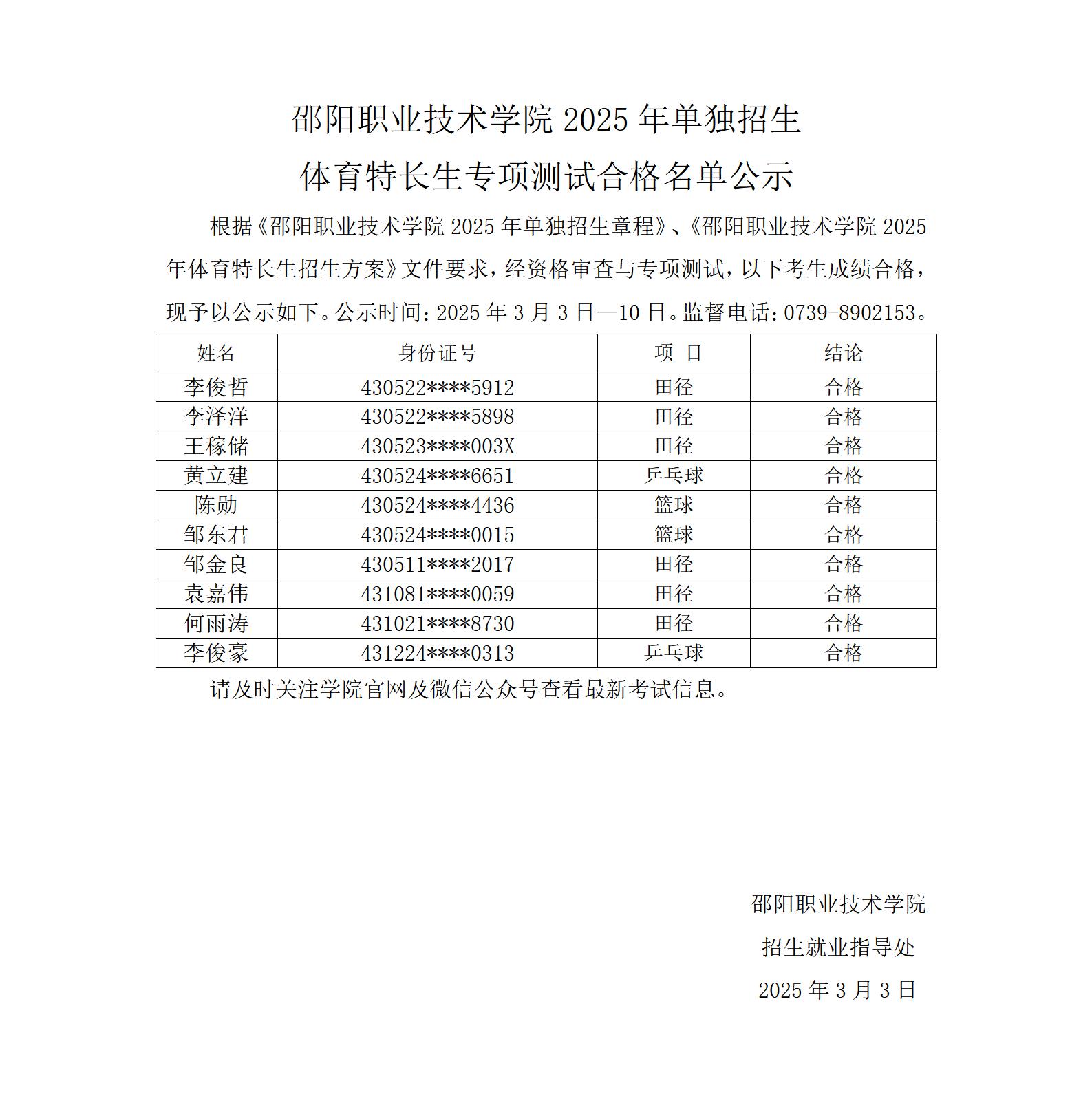 邵阳职业技术学院2025年单独招生体育特长生专项测试合格名单公示