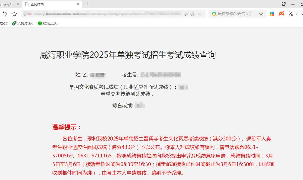 温馨提示:各位考生,现将我校2025年单独招生普通类考生文化素质考试成绩(满分200分)、退役军人类考生职业适应性面试成绩(满分430分)予以公布。你本人对成绩如有疑问,请电话联系0631-5700569、0631-5711165,按照成绩复核程序向我校提出申诉及成绩复核申请,成绩复核时间:3月5日至3月6日(指定邮箱接收邮件时间截止为3月6日16:30前,以邮箱收到邮件时间为准;接听电话时间为每天08:30至16:30)。具体成绩复核申请流程详见我校官方招生信息网(https://www.whvc.edu.cn/zhaosheng)“单招综评”栏目里面的相应文件。