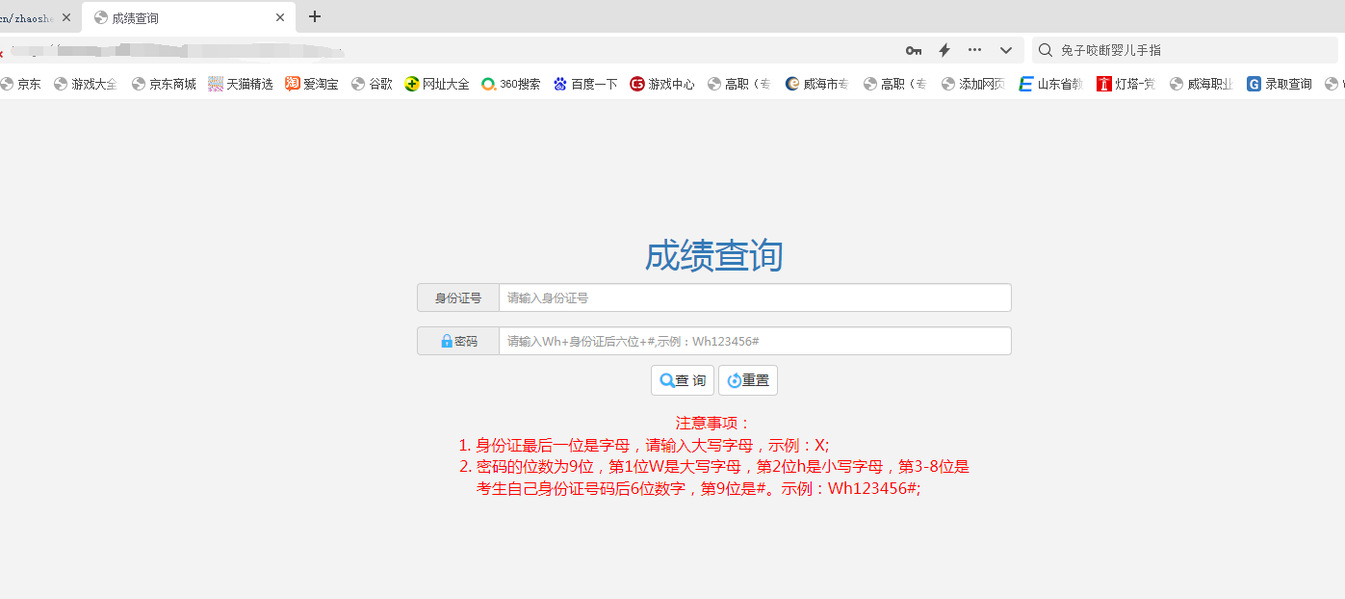 2.考生输入自己的“身份证号”和密码(密码的位数为9位,Wh+考生身份证号后六位数字+#,第1位W是大写字母,第2位h是小写字母,第3-8位是身份证号码后6位数字,第9位是#。示例:Wh148862#),点击“查询”按钮,进入成绩查询信息页面。
