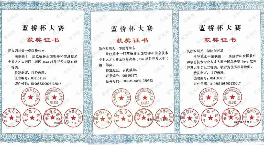 结合“岗证赛课”,组织学生参加“蓝桥杯”java编程大赛、“中银杯”软件测试、“达瓦杯”网页设计大赛、计算机组装与维护大赛等赛事,经过努力,成果颇丰,共获得四川省省赛高职类一等奖6个、二等奖8个、三等奖12个;代表四川省高职院校参加工信部教育部主办的“蓝桥杯”全国软件和信息技术大赛总决赛获高职类一等奖1个、二等奖3个、三等奖2个,通过以赛促教,以赛促学,人才培养质量大大提高。