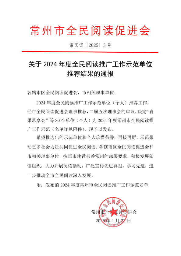 近日,常州市全民阅读促进会公布了2024 年度全民阅读推广工作示范单位推荐结果,我校申报的“共赴阅读盛宴,筑梦书香校园”阅读推广活动获得推荐,获评“2024 年度全民阅读推广工作示范单位”。