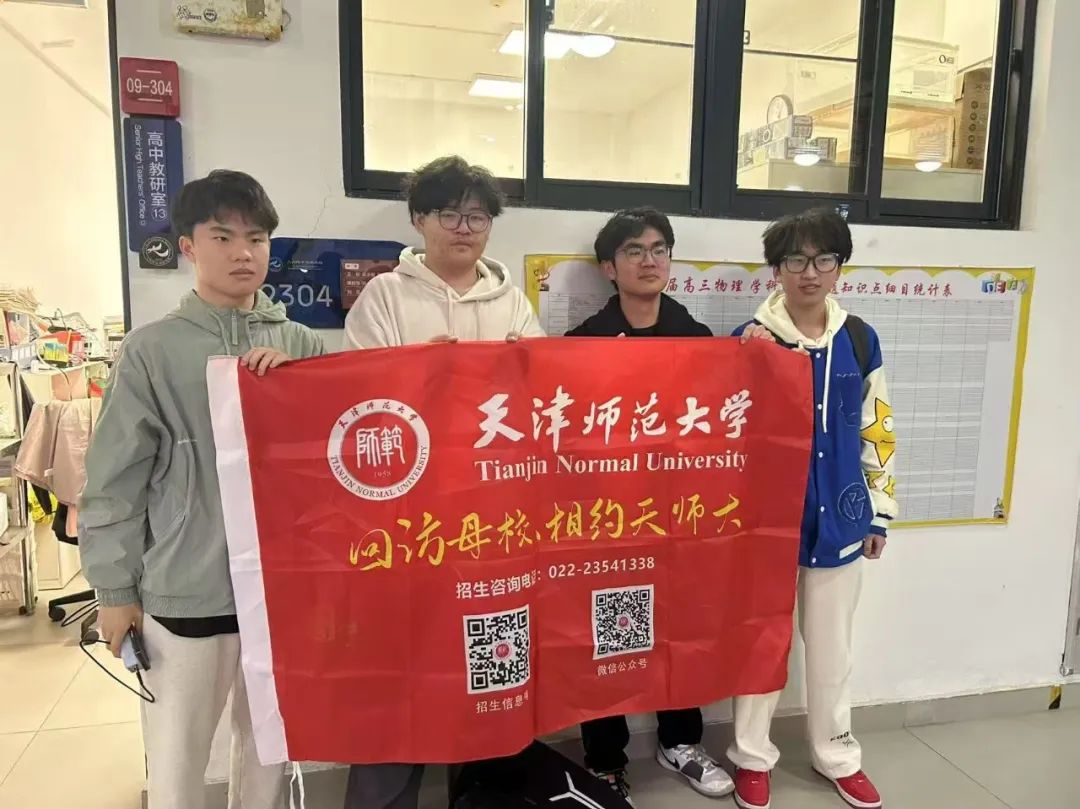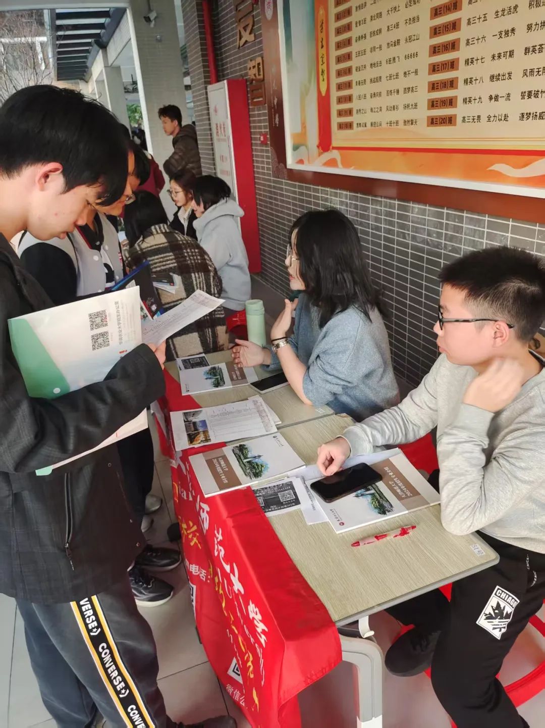 寒假期间,怀着激动与期待的心情,我们团队回到了阔别已久的高中母校,开展宣传实践活动。再次踏入熟悉的校园,那些青春的回忆瞬间涌上心头,曾经的奋斗岁月和懵懂时光历历在目。活动伊始,我们精心布置宣传摊位,摆放着天师大精美书签、便签、钥匙扣等文创,展示校园风光与特色专业的宣传册。面对学弟学妹们好奇又充满憧憬的眼神,我们热情地分享着在师大生活的点点滴滴,从丰富多彩的社团活动,到学术氛围浓厚的课堂,再到温馨的宿舍生活,希望能为他们描绘出一幅真实而美好的大学画卷。