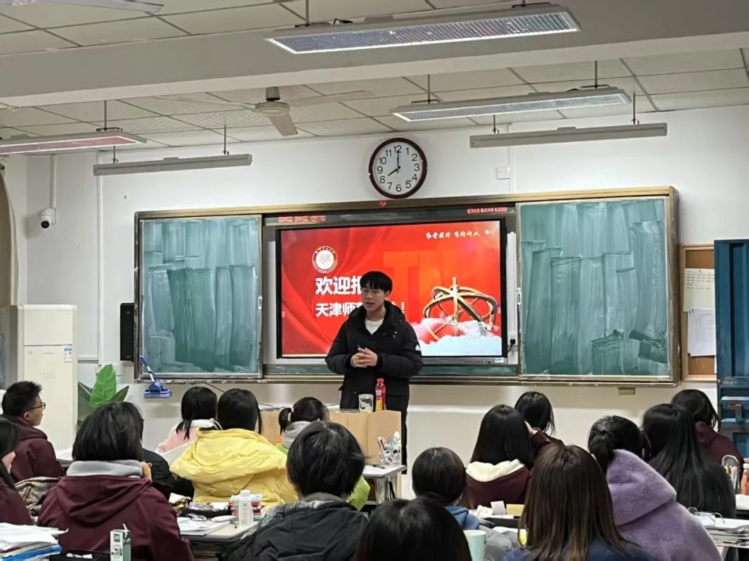 此次活动,团队成员做了充足准备。在开始宣讲之前,我们将天师大文创产品和宣传单发给学弟学妹们,吸引了学弟学妹们的兴趣,将活动氛围带动起来。随后播放了招生宣传视频,通过PPT着重讲解了天师大的教育教学特色、优秀的师资力量和丰富的教学资源,全方面为学弟学妹们介绍天师大和天津这座城市。我们细致地为学弟学妹们进行针对性的答疑解惑,包括专业前景、志愿规划、大学校园生活等。
