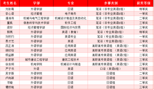 近日,第31届湖北省翻译大赛决赛结果揭晓,我校学子表现优异,共计18人获奖;其中特等奖2人,一等奖4人,二等奖5人,三等奖7人。