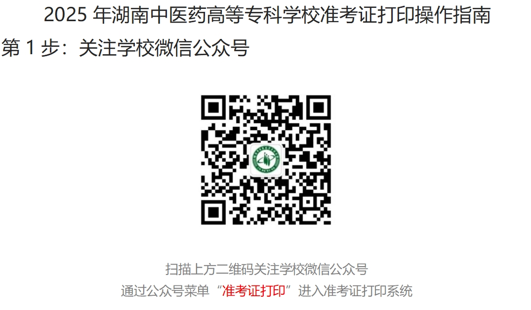 1.考生在我校微信公众号打印准考证前请详细阅读我校《2025年湖南中医药高等专科学校准考证打印操作指南》相关内容,考生须使用缴费时所用的同一微信号下载准考证,否则将无法下载。 2.第一志愿考生打印准考证时间:2025年3月6日—3月7日;第一志愿考生考试时间:2025年3月8日,具体时间请看准考证。