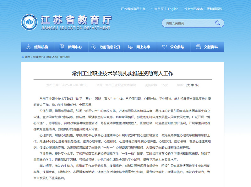 江苏省教育厅:常州工业职业技术学院扎实推进资助育人工作