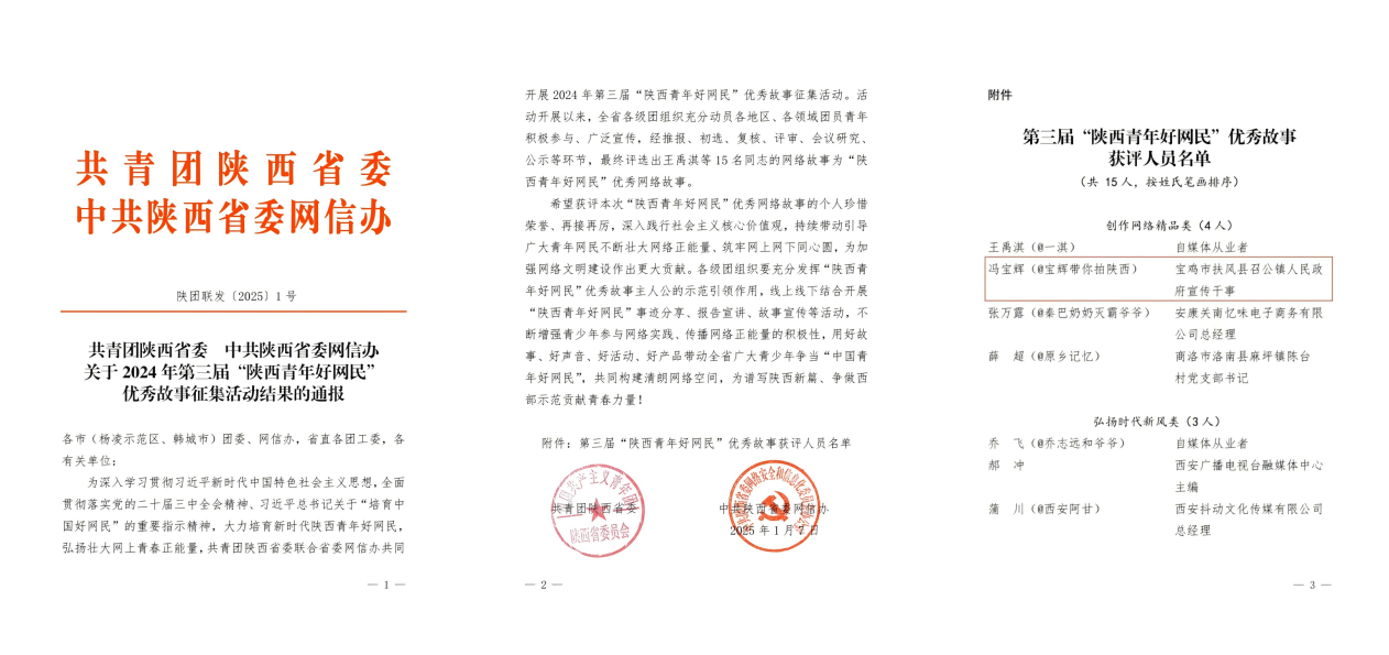 近日,共青团陕西省委、中共陕西省委网信办联合发布《共青团陕西省委 中共陕西省委网信办关于2024年第三届“陕西青年好网民”优秀故事征集活动结果的通报》(陕团联发〔2025〕1号)。我校校友冯宝辉获评2024年第三届“陕西青年好网民”优秀故事。
