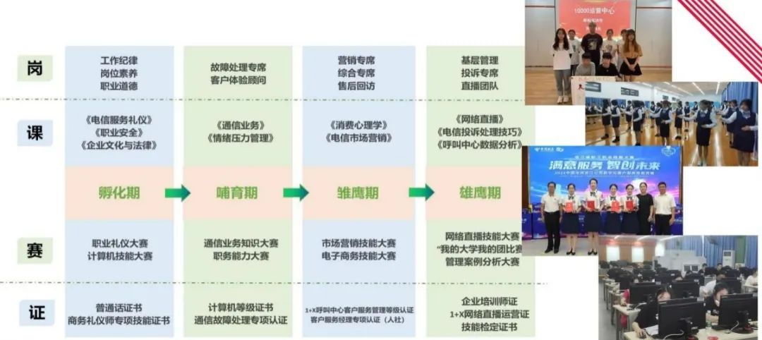 专业为浙江省现代学徒制试点专业,学生通过分层教学进入杭州万号基地、万号大学通信服务基地,实践教学条件优越,以上实训基地为浙江省生产性示范实训基地。通过带班师傅的精心指导,小班化形式适应企业文化与校园文化碰撞,提高自身业务处理技能、沟通营销技能、情绪管控调节能力,为无缝对接职业岗位奠定基础。