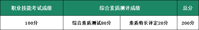 职业技能考试成绩折算公式:(职业技能理论考试成绩+职业技能操作考试成绩) /3,满分100分。(考生参加的职业技能考试成绩类别须与所报考专业招生类别一致)