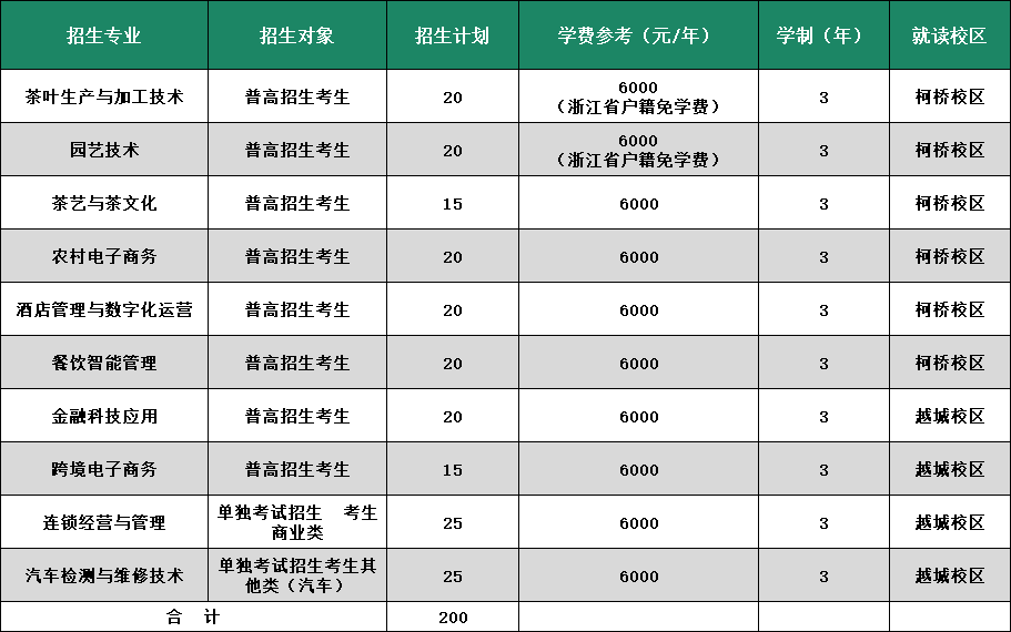 2025年浙江农业商贸职业学院共有10个专业参与高职提前招生,总计划数为200人,具体招生专业、招生类别详见下表: