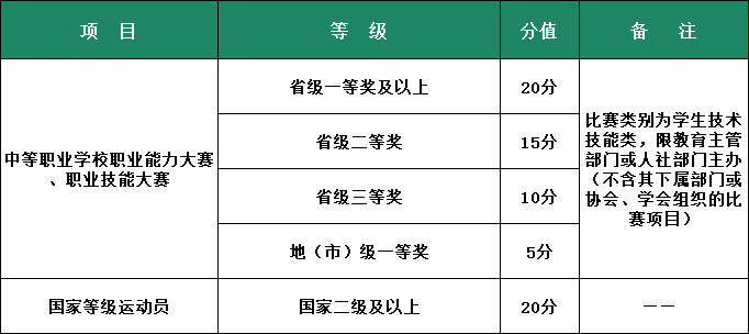 1.同一考生如符合多项赋分条件的,同类项只取高分项,不同类项可累计赋分,赋分最高不超过20分,所有团体项目成员按个人项目分值的50%计分。