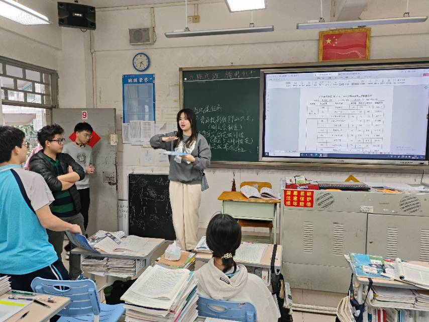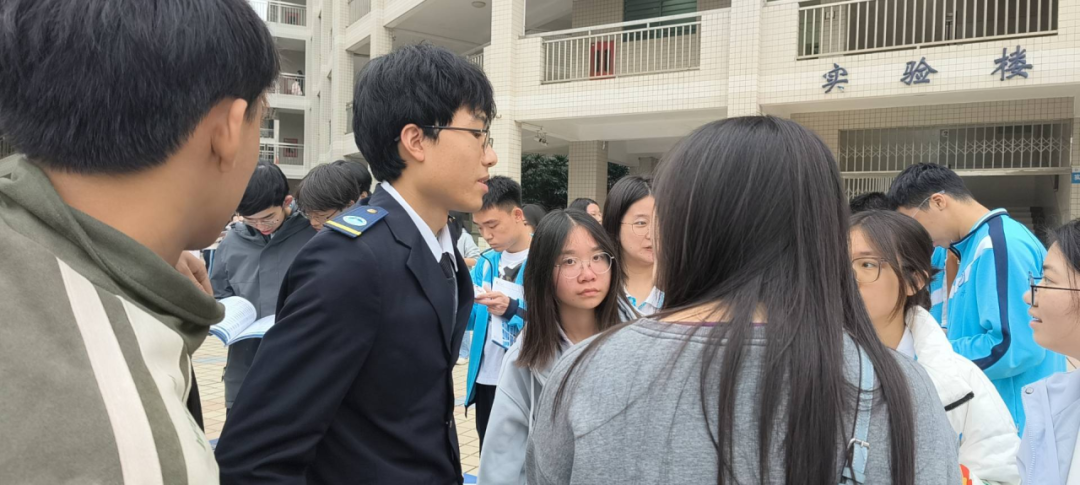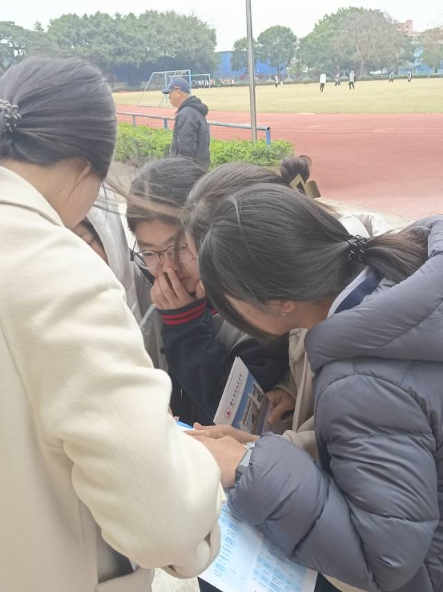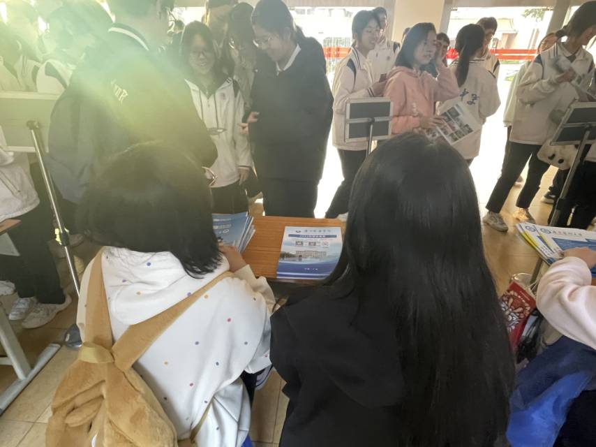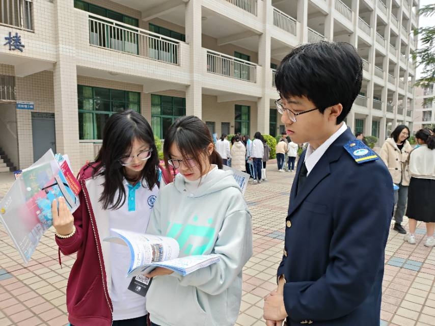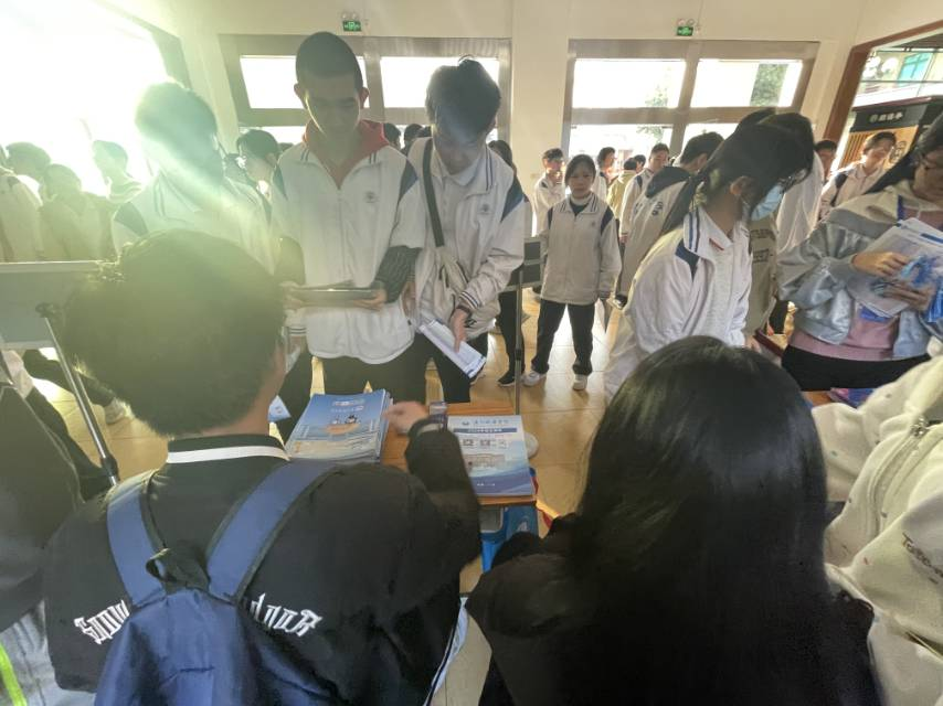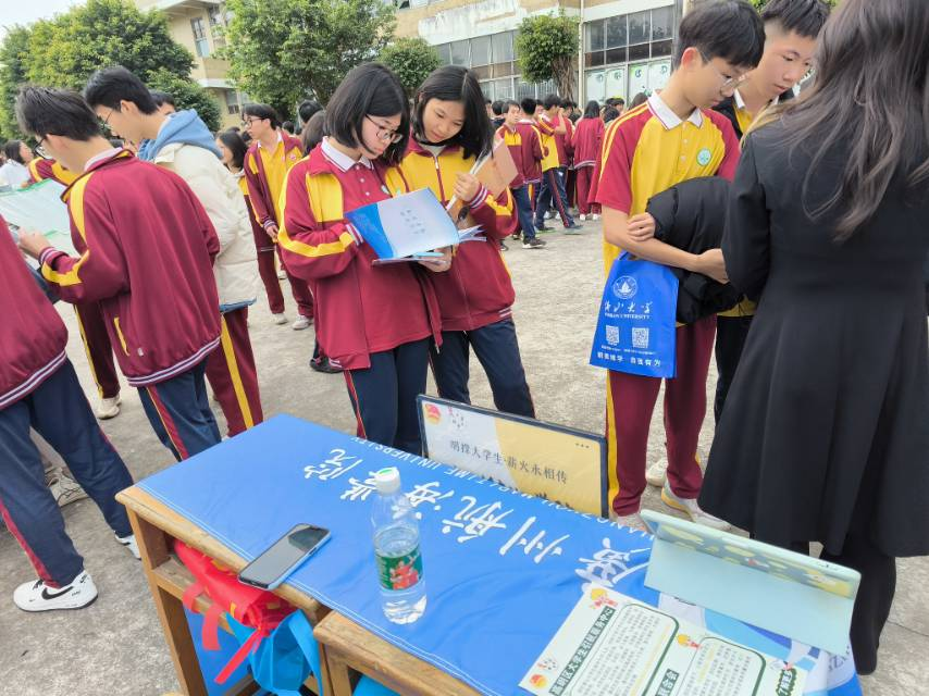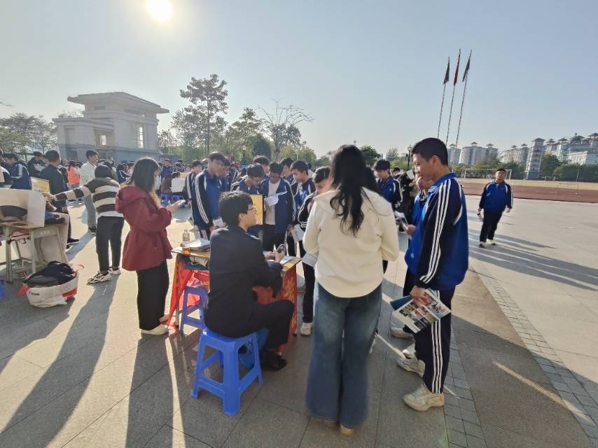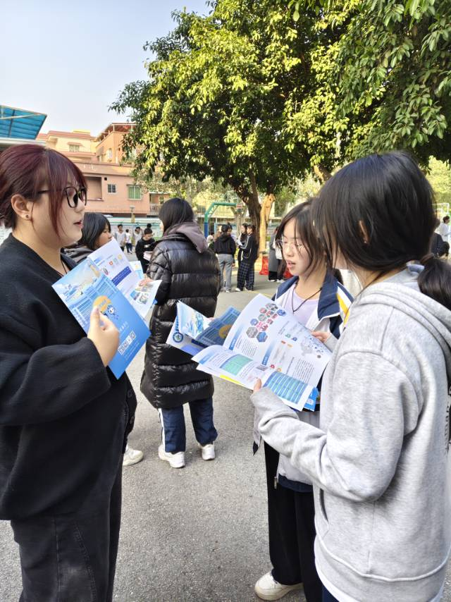 在佛山市第三中学中心广场,团队搭建线下宣讲摊位,通过派发海报、书签等物资吸引学生驻足。队员结合自身经历,解答“专业就业前景”“大学实践机会”等热点问题,并建立线上答疑群提供持续咨询。