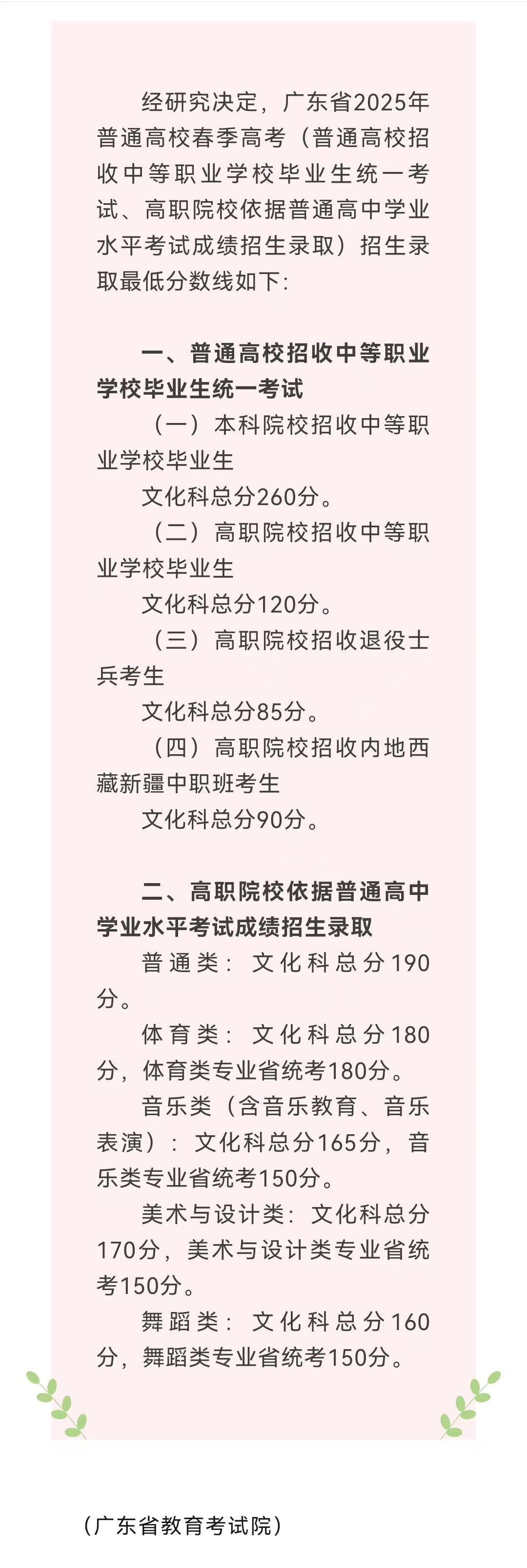 关于公布广东省2025年普通高校春季高考招生录取最低分数线的通知