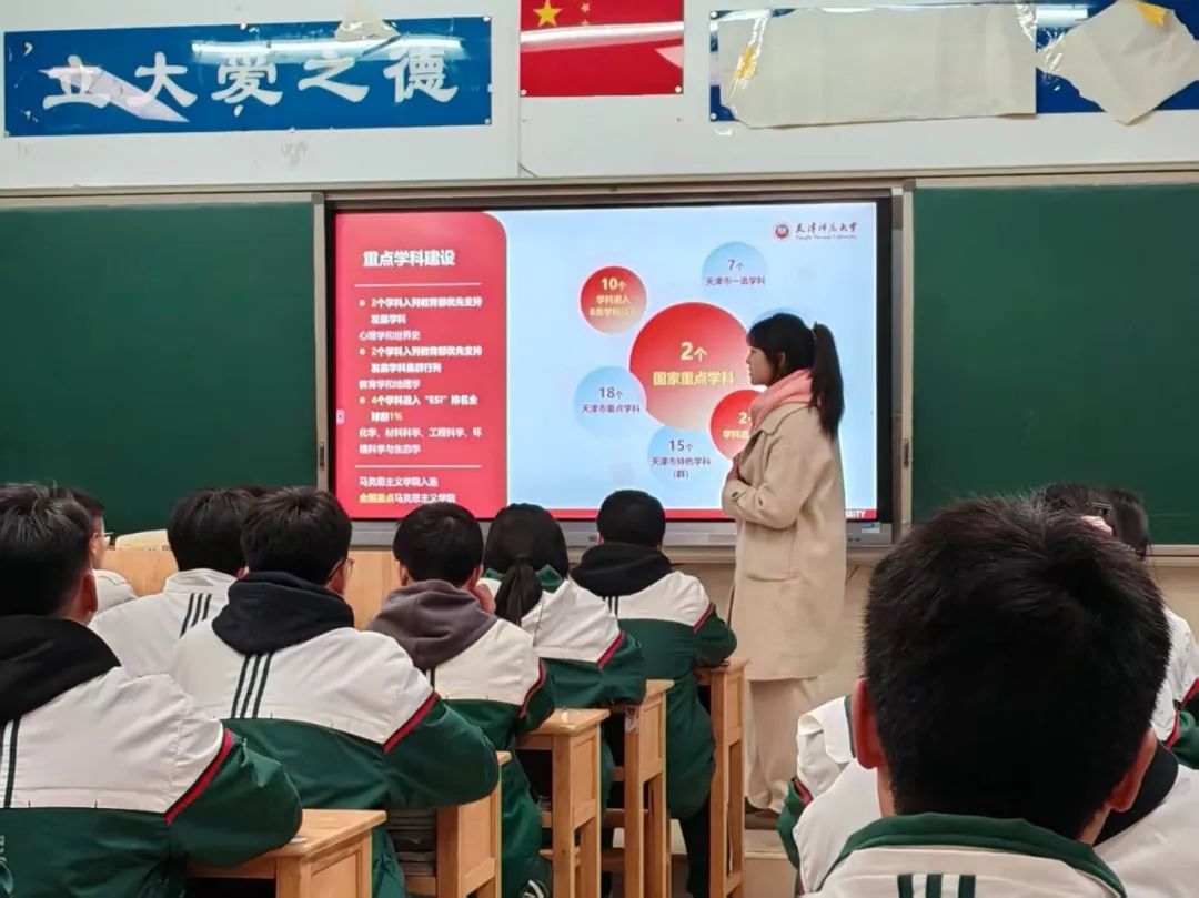 当我们走进班级进行宣讲,在同学们的提问中,他们对大学的向往与热情深深地感染了我们。我们宣讲的心情更加激动澎湃,我们从介绍天津这座城市,再到详细介绍师大的校园文化生活和各项政策,不仅希望同学们能了解天师大,更是希望学弟学妹们能了解天津这个美丽的城市。