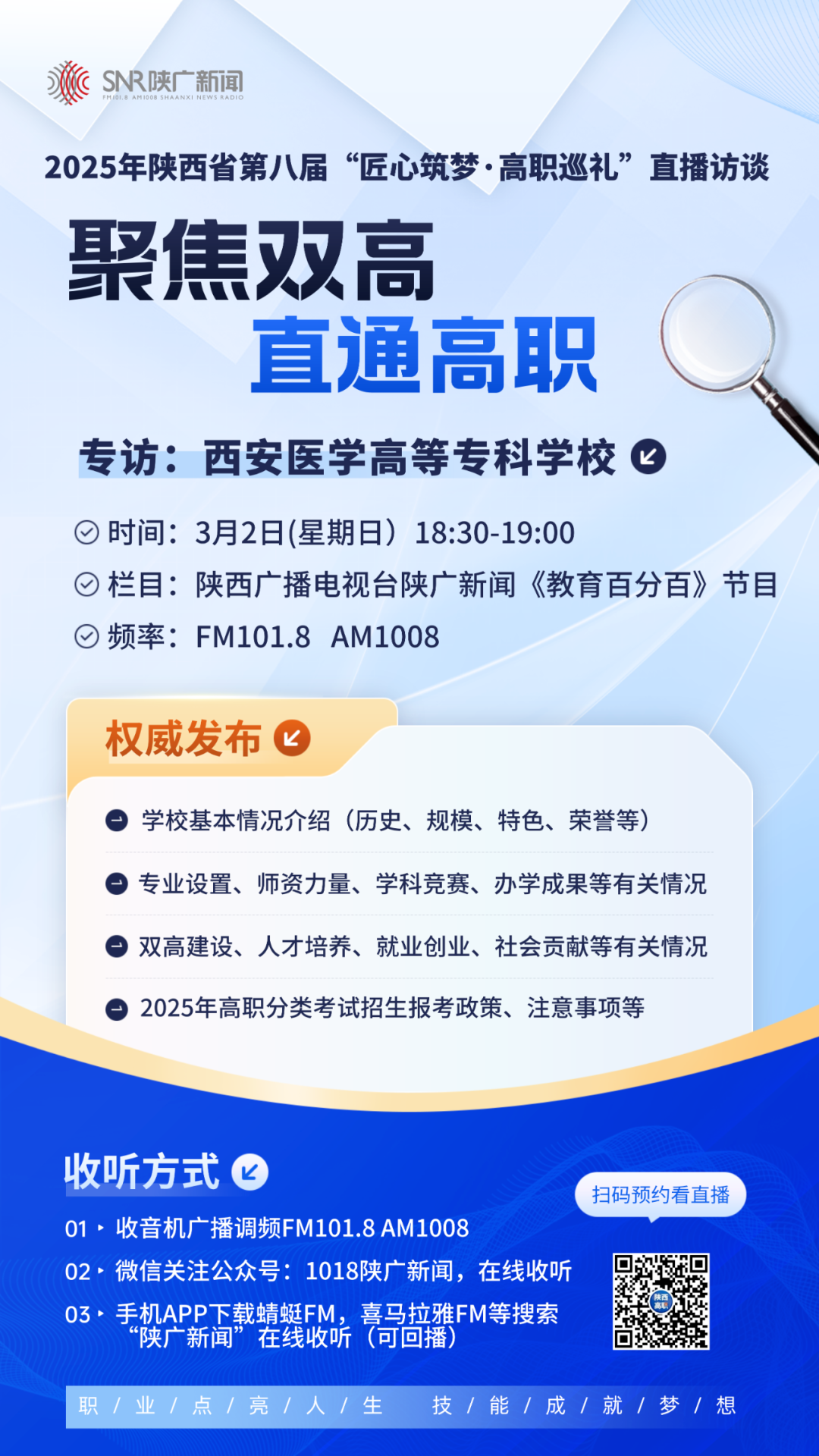 2025年陕西省高职院校分类考试招生报考在即,《陕西都市快报》特别推出“升学帮 直通高职”板块,搭建平台,权威解读报考政策,为考生精准择校,精挑专业,出谋划策。3月2日10:30-11:30,锁定陕西都市快报官方抖音、微信视频号,大屏、小屏联动,带您走进陕西省“双高计划”高水平专业群建设单位、省级示范性高等职业院校-西安医学高等专科学校