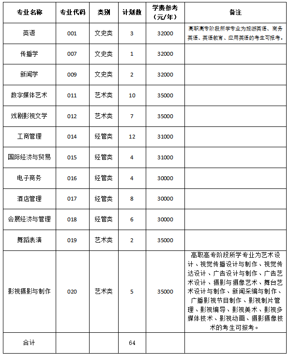 (注:具体招生计划以省教育考试院公布为准,学费标准供参考,最终以物价部门批准公布为准。)