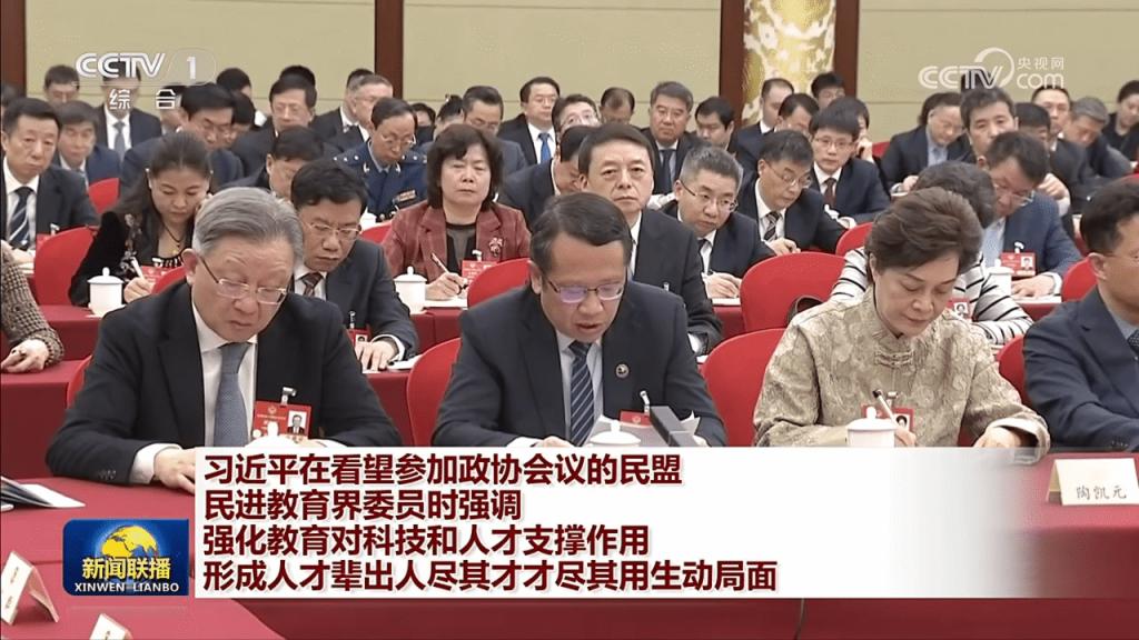 在听取大家发言后,习近平发表重要讲话。他表示,很高兴同大家一起讨论,听取意见建议。他代表中共中央,向在座各位委员,并向广大民盟、民进成员和教育界人士,向广大政协委员,致以诚挚问候。