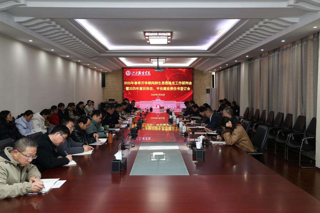 新闻中心讯(文/龙瑞行 图/万强)2月26日下午,我校召开2025年春季开学期间师生思想稳定工作研判会暨2025年意识形态、平安建设责任书签订会,传达学习我省有关文件精神,听取春季开学前后校园安全稳定工作落实情况汇报,签订2025年意识形态工作和平安建设责任书,为高水平安全护航学校高质量发展提供坚强保障。理事长涂燕萍、党委书记林井萍、校长薛家宝及在家全体校领导出席会议,党委副书记唐新强主持会议。各学院(部)党政负责人、各职能部门主要负责人参加会议。