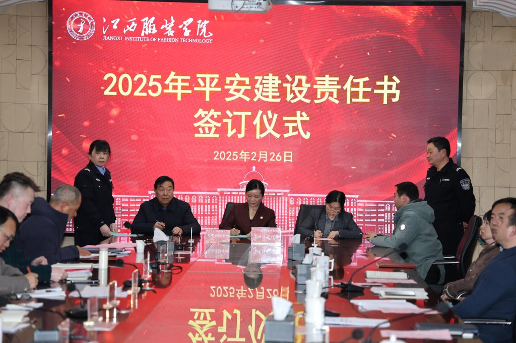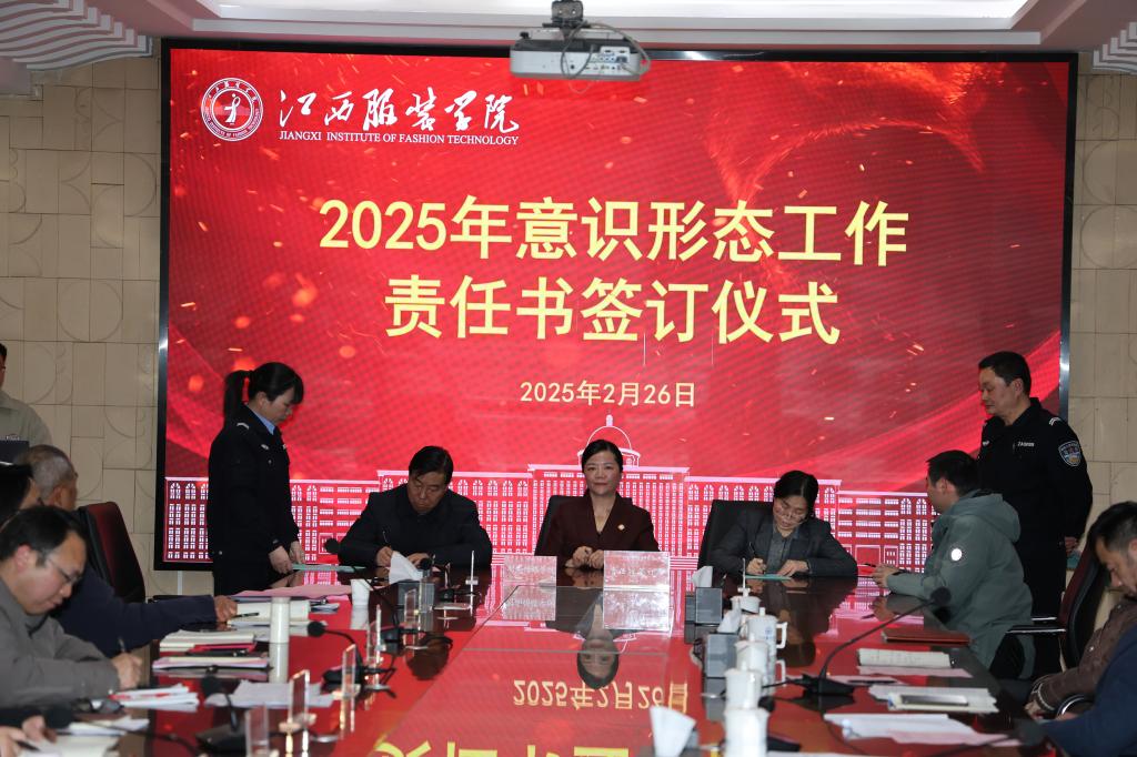 随后,举行了江西服装学院2025年意识形态工作和平安建设责任书签订仪式。理事长涂燕萍、党委书记林井萍、校长薛家宝与各二级学院(部)负责人签订了责任书,以责任书的形式明确了双方在意识形态工作和平安建设中的责任和任务,形成了一级抓一级、层层抓落实的良好工作格局。