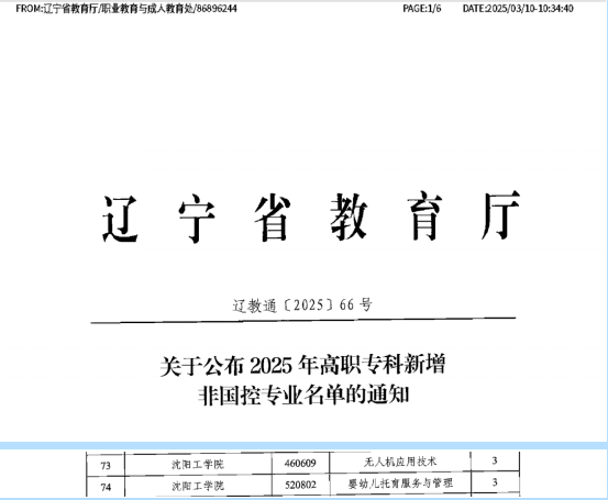 近日,辽宁省教育厅发布《关于公布2025年高职专科新增非国控专业名单的通知》(辽教通〔2025〕66号),我校申报的无人机应用技术、婴幼儿托育服务与管理两个专业正式获批。此次获批标志着我校在高等职业教育专业建设中取得新突破。