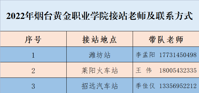 潍坊:潍坊火车站; 莱阳:莱阳火车站; 招远:招远汽车站。3、接站老师及联系方式