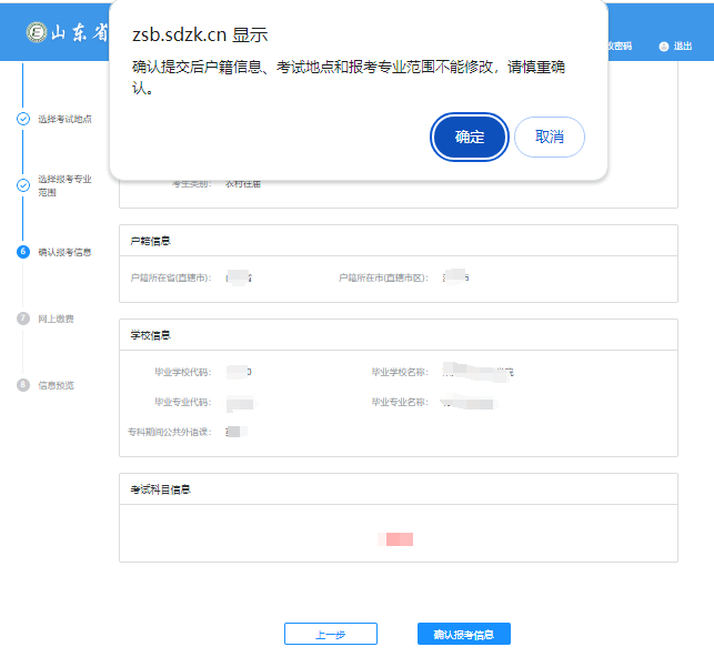 考生进入“确认报考信息”界面,可查看报考信息,确认无误后可点击【确认报考信息】按钮,确认报考信息后考生所填写的“户籍信息”、 “考试地点”、 “报考专业范围”等信息不可修改,如下图所示: