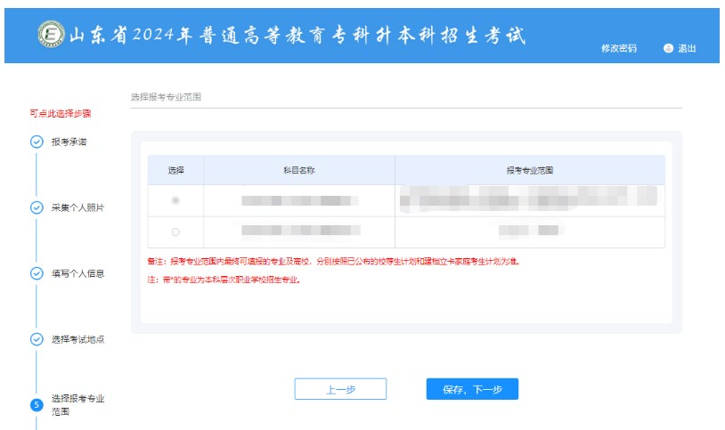 考生进入选择报考专业范围界面,选择专业范围,考生对应个人情况填写是否兼报及对应的专业。如不需要参加考试,页面会显示“不需要考试”字样。3+2仅报:“是否兼报”默认显示“否”;非3+2考生则不显示“是否兼报”。确认无误后点击【保存,下一步】可进入确认报考信息界面,如下图所示: