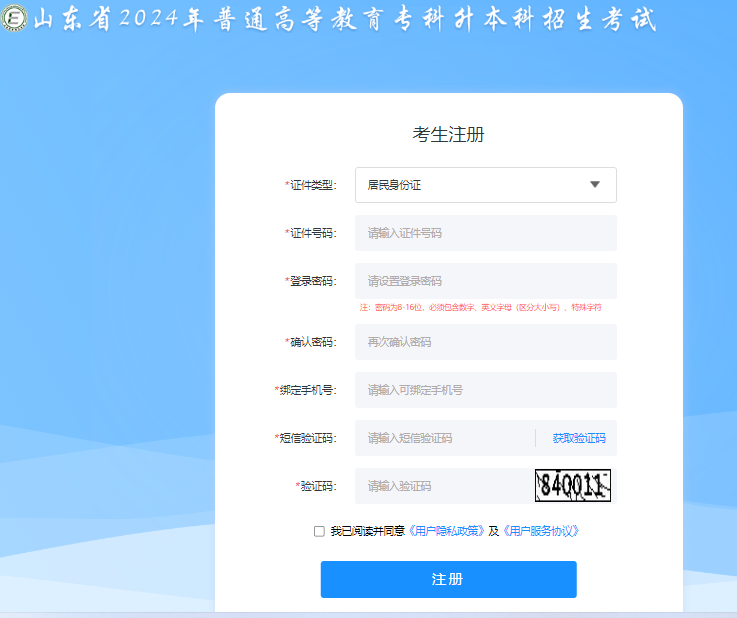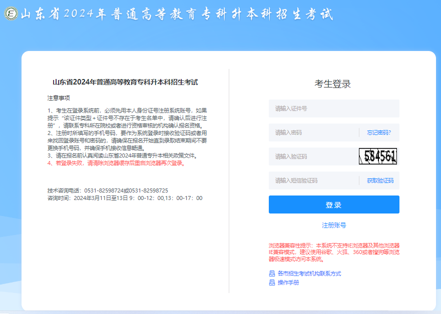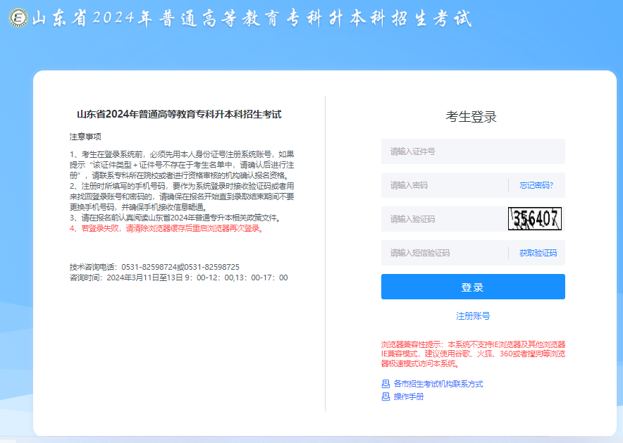 考生通过在浏览器地址栏中输入https://zsb.sdzk.cn/进入网站,如下图所示: