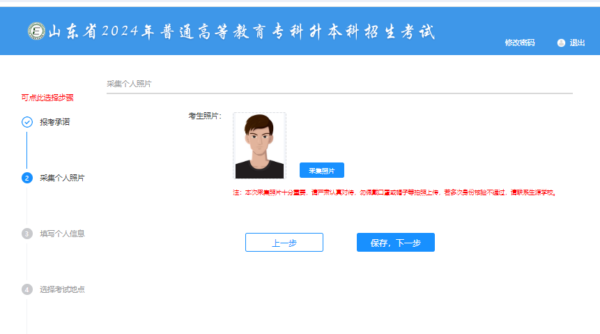 照片上传完成后,点击采集照片弹窗界面的【确认】按钮,照片确认完成后页面显示所上传的照片,点击【保存,下一步】即可进入填写个人信息界面,如下图所示: