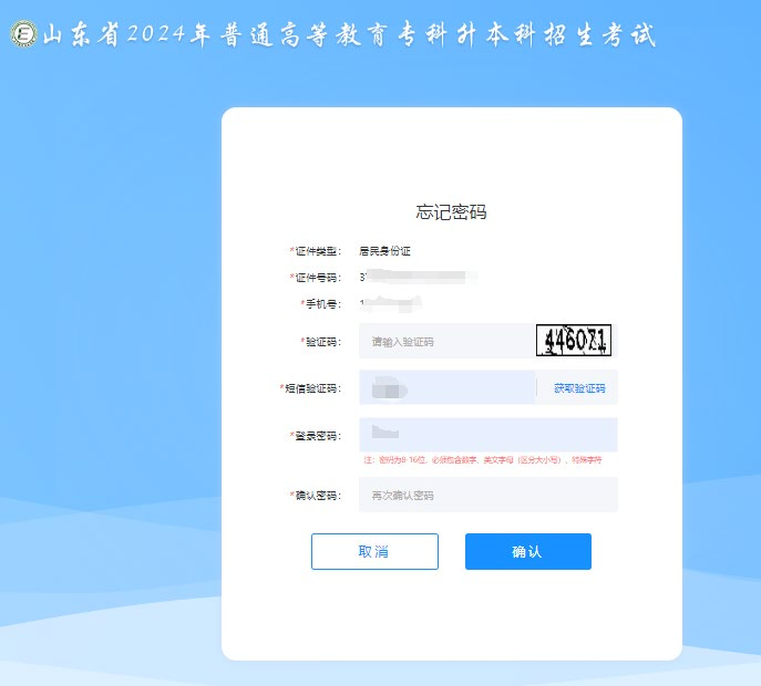 若考生已注册且忘记登录密码,可点击登录界面的【忘记密码?】按钮进入密码找回界面,选择证件类型,输入证件号码、注册手机号和验证码,点击【找回登录密码】按钮,考生注册手机号会接收到一个10位的新密码,如下图所示: