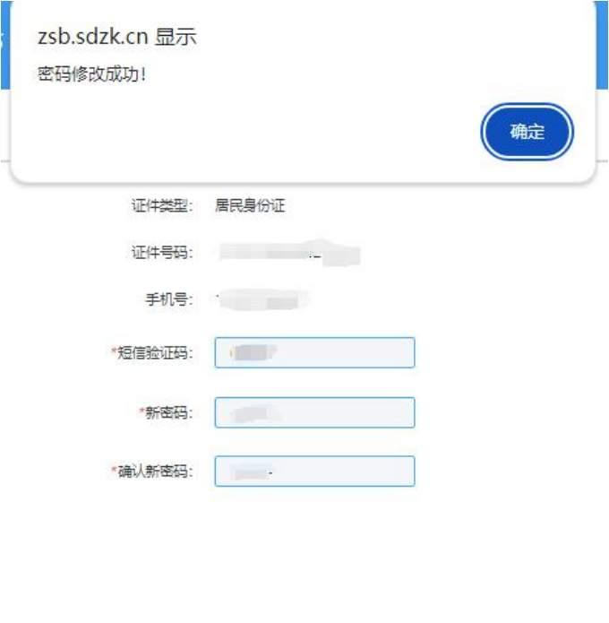 考生成功登录后,如需修改密码,可点击登录界面的【修改密码?】按钮进入修改密码界面,输入固定短信验证码、新密码、确认信密码,点击【确认】按钮,若修改成功,则系统提示“密码修改成功!” ,如下图所示: