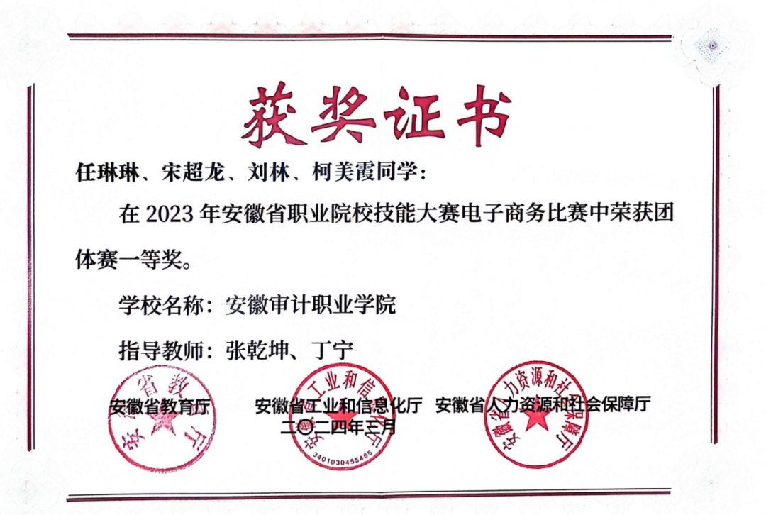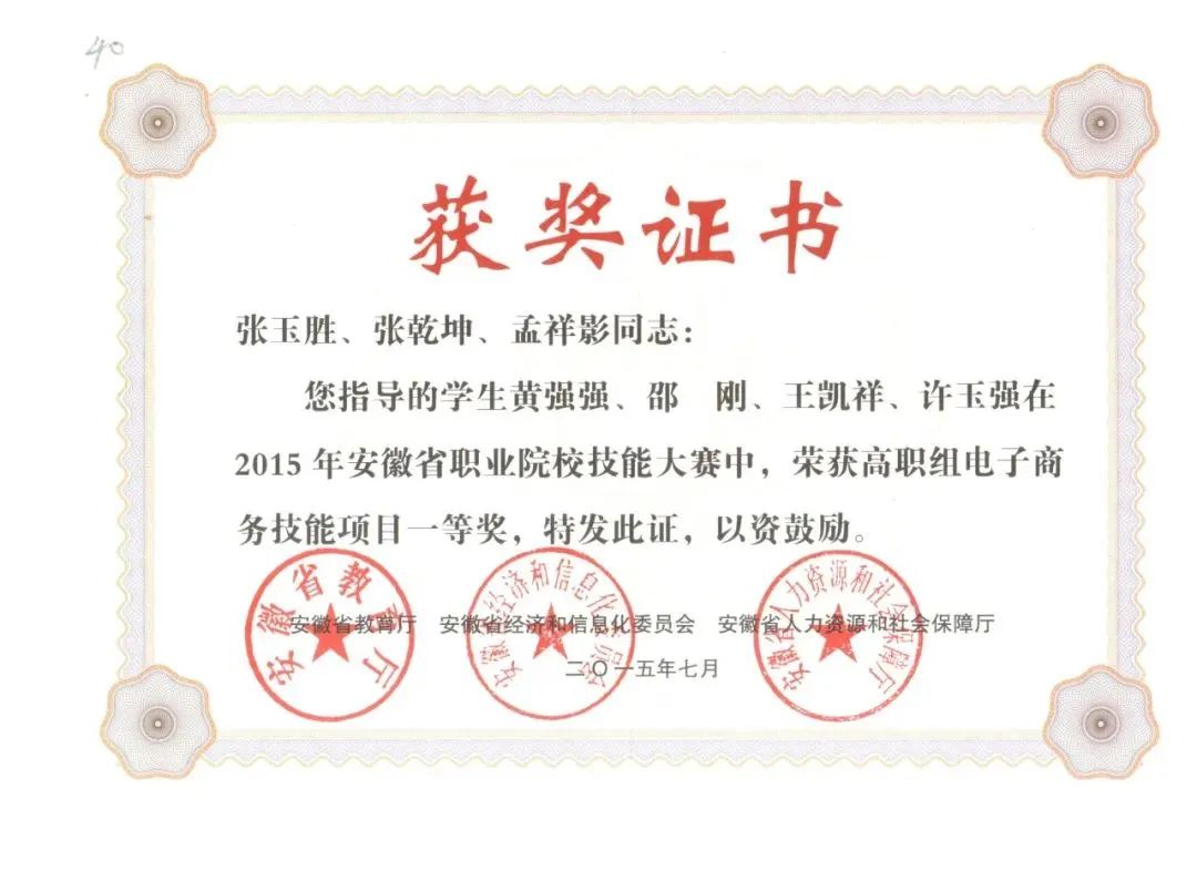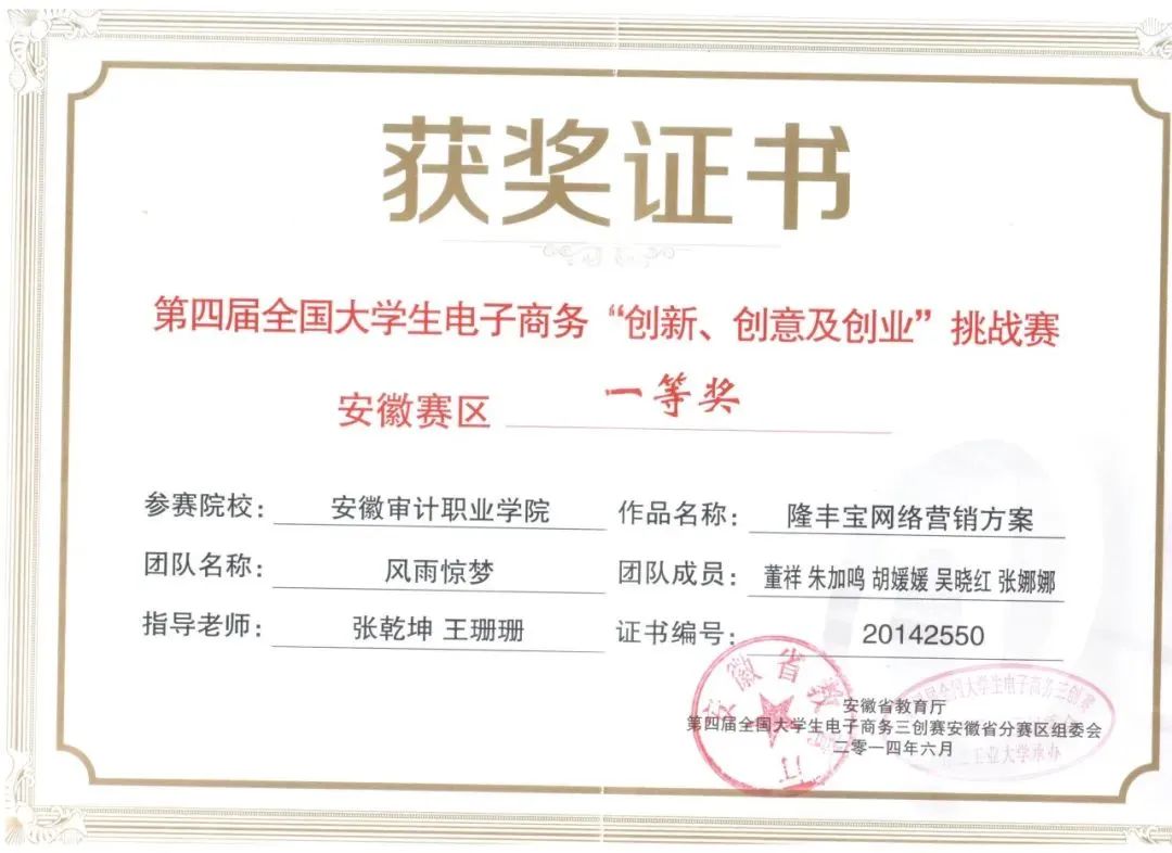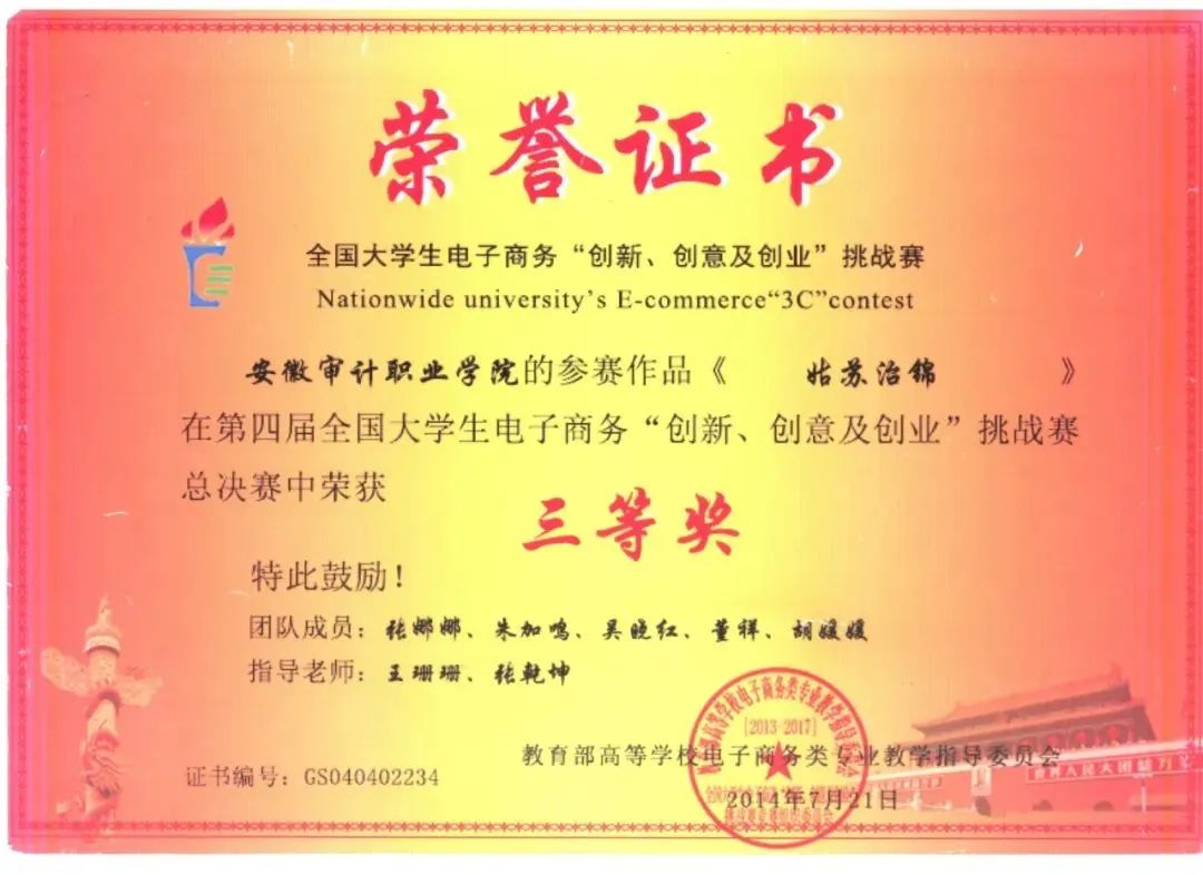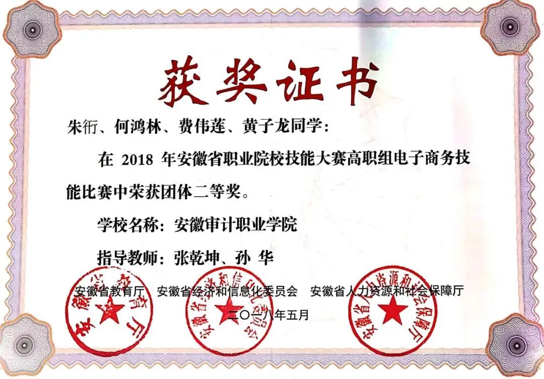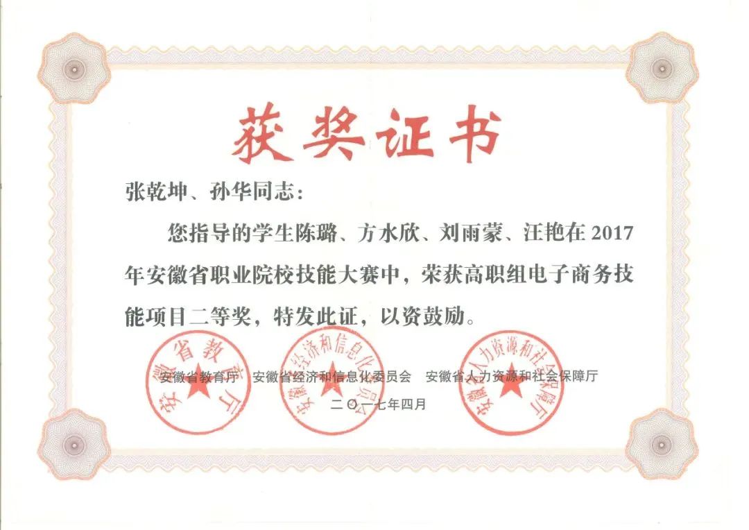 电子商务专业多次荣获安徽省大学生学科和技能竞赛A类项目奖项及安徽省大学生学科和技能竞赛B类项目一等奖,其中在创新、创意及创业大赛中荣获国赛三等奖2项、省赛一等奖2项,在全国职业院校技能大赛安徽省赛中荣获一等奖3项,其他重要技能比赛获奖多达80余项。