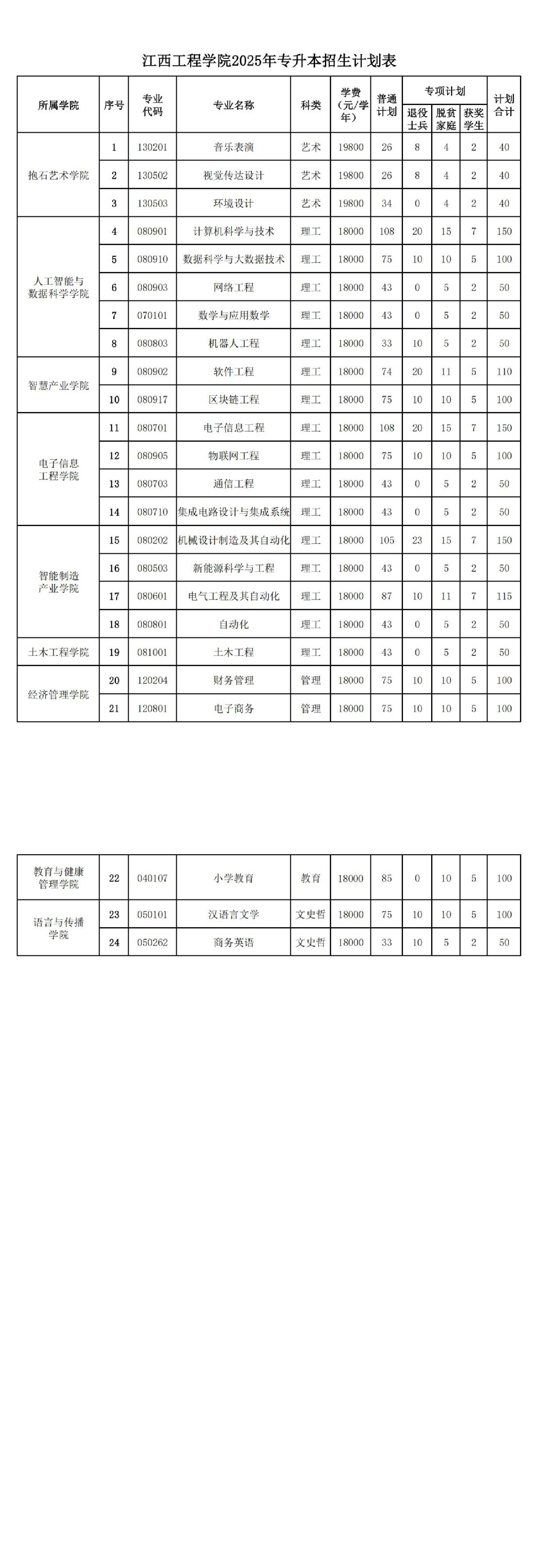 江西工程学院2025年专升本招生专业、计划及收费标准分别是多少?