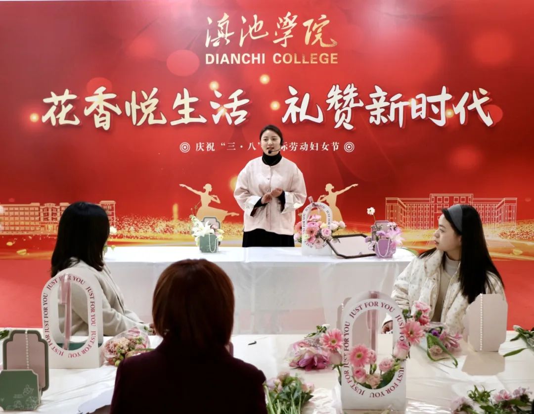为庆祝“三·八”国际劳动妇女节,丰富女教职工的精神文化生活,提升艺术修养和生活情趣,2025年3月7日,滇池学院工会和妇联在海埂校区崇志楼学生活动大厅联合举办“花香悦生活 礼赞新时代”主题插花活动。此次活动吸引了全校在职女教职工的积极参与,大家共同度过了一个充满花香与艺术气息的节日。