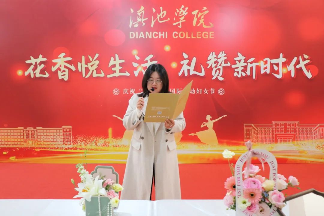 滇池学院校长助理、妇联副主席陈雯向学校全体女教职工表达最衷心的祝愿,愿大家芳华自在,岁月鎏金,既有“春风化雨”的教育情怀,亦怀“笑看花开”的从容心境,祝大家节日快乐!她充分肯定了学校全体女教职工在家庭和社会建设中发挥的重要作用,尤其在学校建设和各项工作中撑起了“半边天”,为学校的发展做出了不可替代的积极贡献,感谢了大家以专业的态度和敬业的精神为学校带来了无限的活力与温暖。