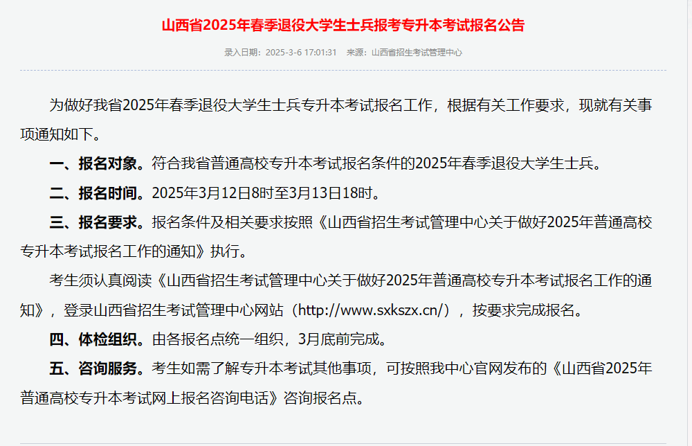 山西省2025年春季退役大学生士兵报考专升本考试报名公告