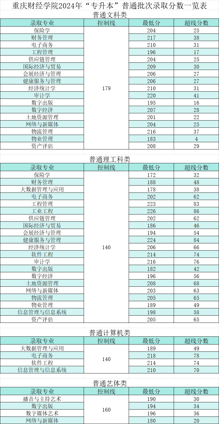 重庆财经学院2024年“专升本”普通批次录取分数一览表