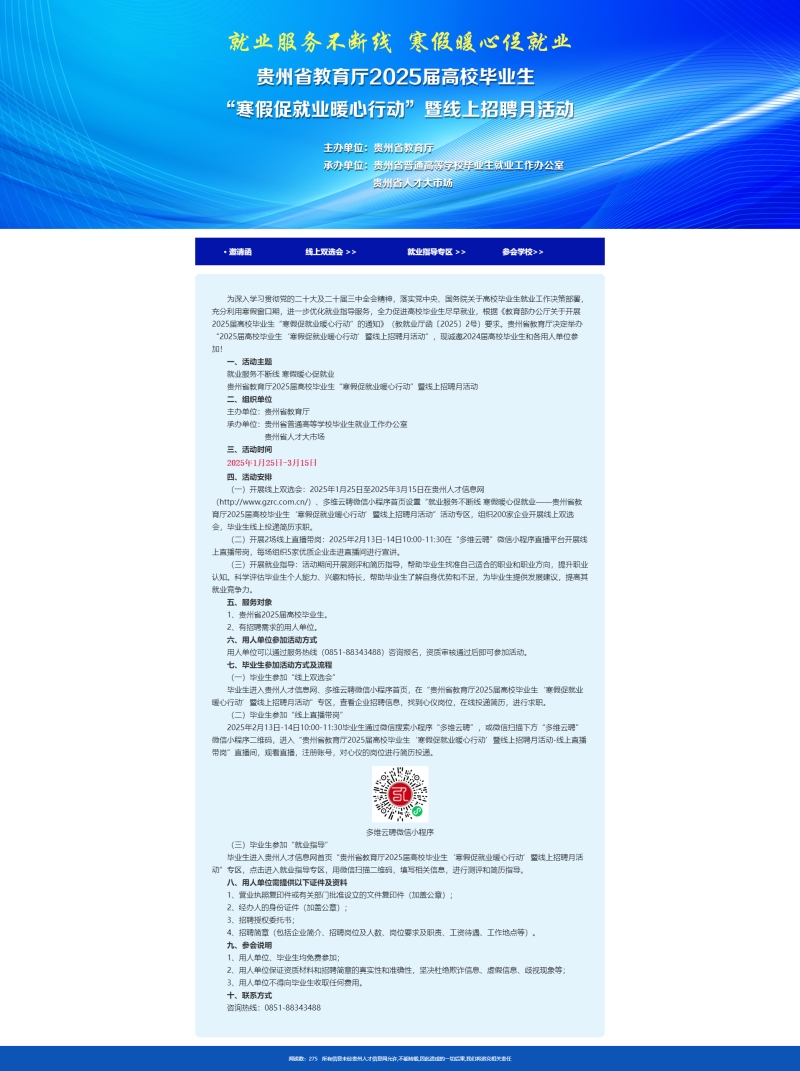 (一)开展毕业生线上双选会。2025年1月25日至2025年3月15日在贵州人才信息网(http://www.gzrc.com.cn/ )、多维云聘微信小程序设置“就业服务不断线 寒假暖心促就业——贵州省教育厅2025届高校毕业生‘寒假促就业暖心行动’暨线上招聘月活动”活动专区,组织200家企业开展线上双选会。
