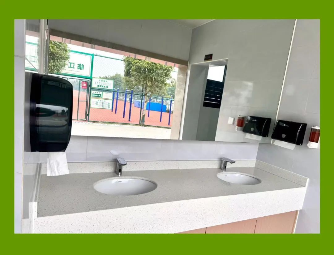 临江苑运动场室外卫生间改造完成,同学们在大汗淋漓运动后能就近洗手擦汗啦。
