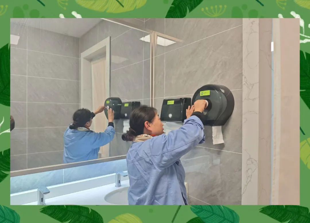 工作人员随时添加厕所用纸,为春日校园增添满满暖意。