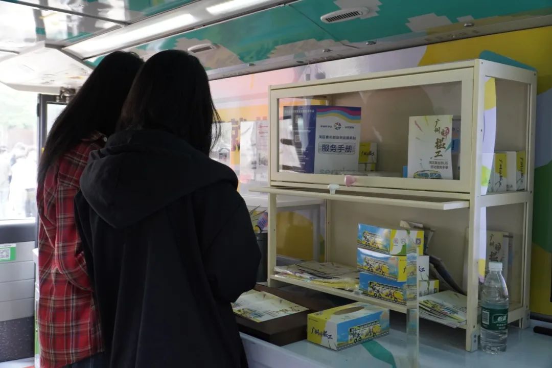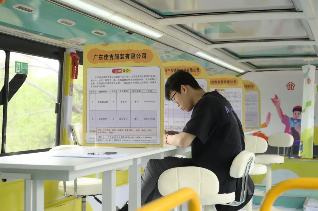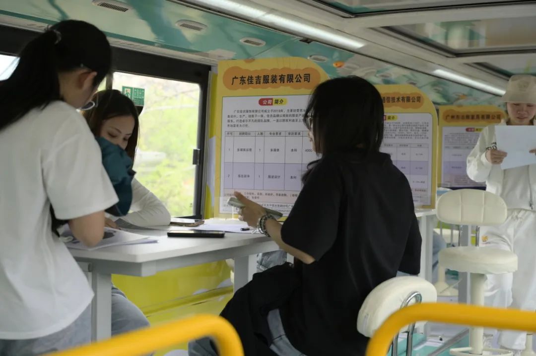 作为此次活动的亮点之一,湾区就业BUS提供了集政策宣讲、线上招聘、职业咨询等功能于一体的“移动一站式公共就业服务”。在巴士内,设有职场心愿墙、AI招聘区、一对一求职面试区等多个区域,学生们通过这些设施不仅能够深入了解广州市的就业政策,还能与招聘企业互动,进行现场面试。巴士外的直播带岗区突破了时空限制,在线求职者也能参与其中,直观感受企业文化和岗位要求。