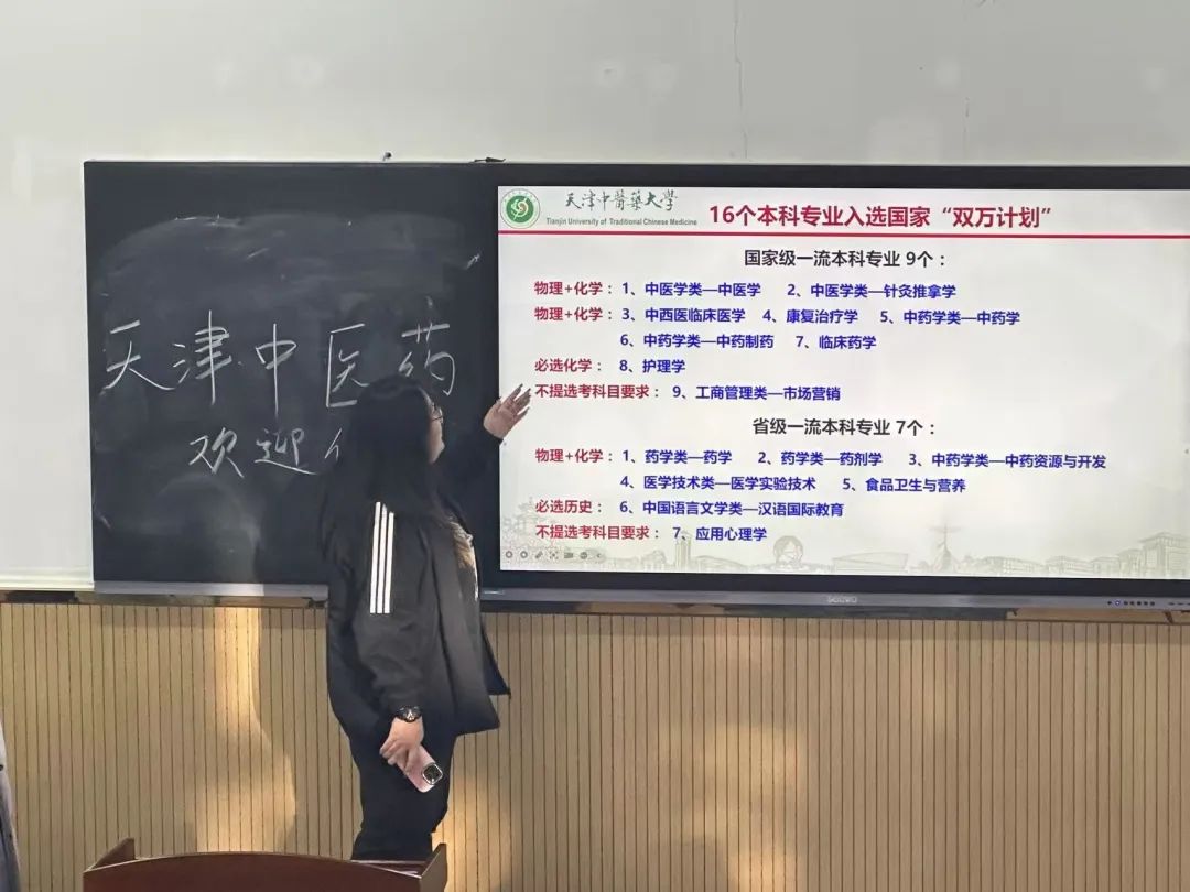 我们向母校的学弟学妹们介绍了天津中医药大学的概况,录取情况以及就业前景。并且向他们展示了学校的环境,收获了良好的反响。2