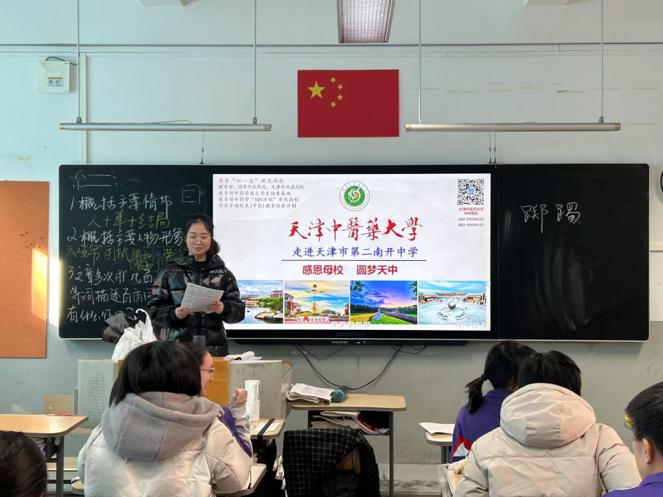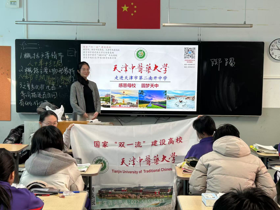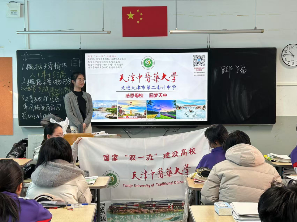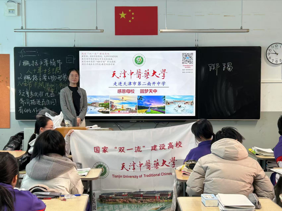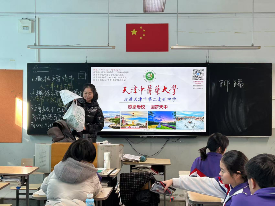 我向同学们讲述了中医药的基础知识,并且发扬了中医药需要传承下去的观点,向他们讲述如果有兴趣于医学类的专业,欢迎报考天津中医药大学,因为天津中医药大学是“卓越医生教育培养计划”改革试点高校、国家首批“双一流建设高校,也是“教育援外基地”“中国东盟教育培训中心”,拥有中医学、中药学等多个国家级和省部级重点学科,这些学科在国内外享有较高的学术声誉;也是因为在这里有兢兢业业的老师,勤奋好学的学生们,关心同学们的校领导,所以我欢迎大家来到天津中医药大学这样的一个温馨温暖的大家庭中。
