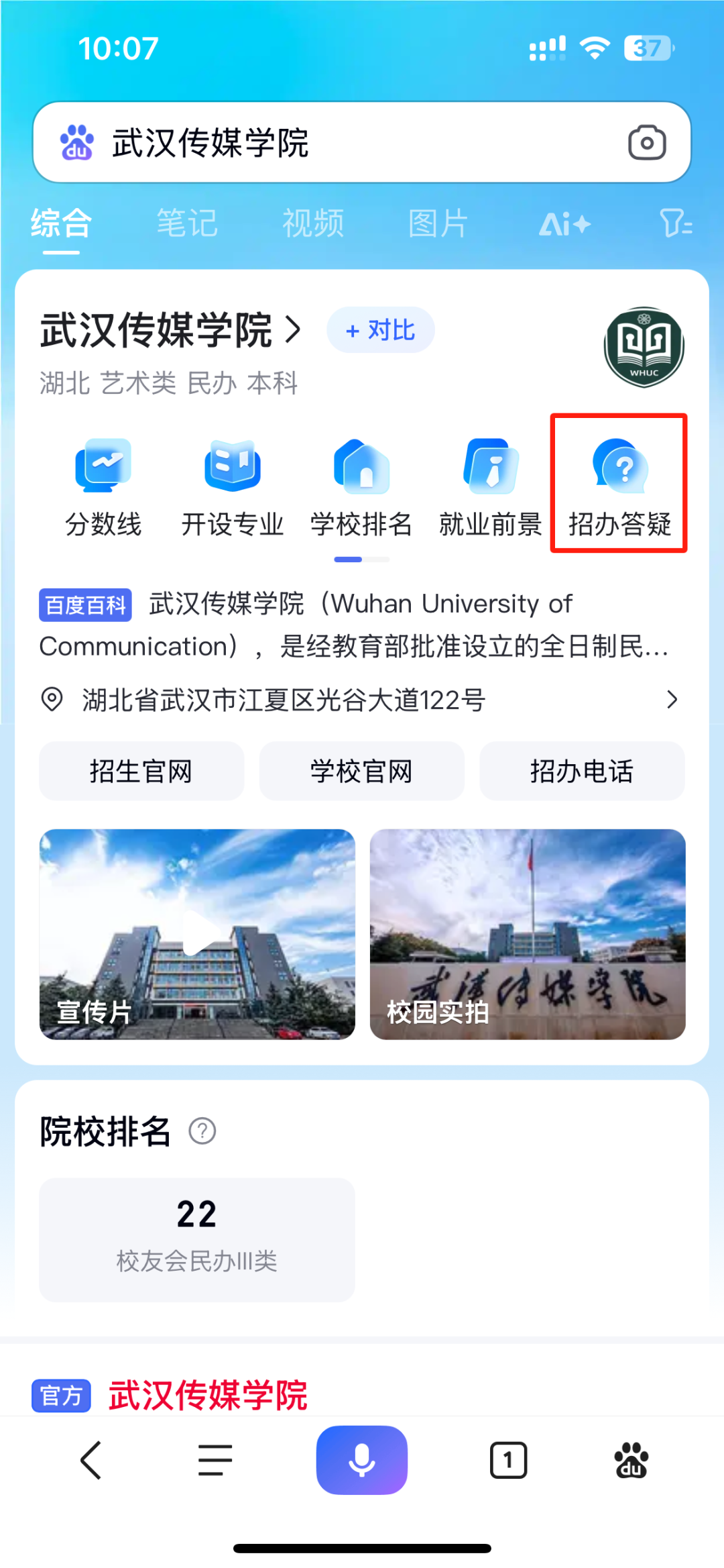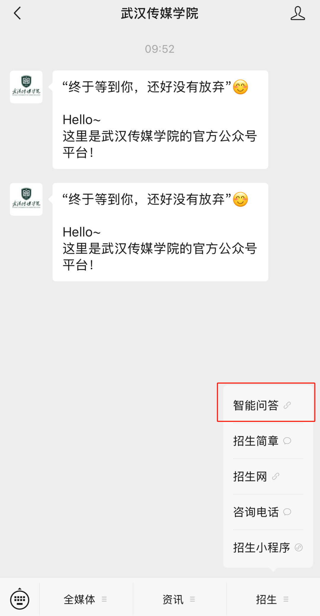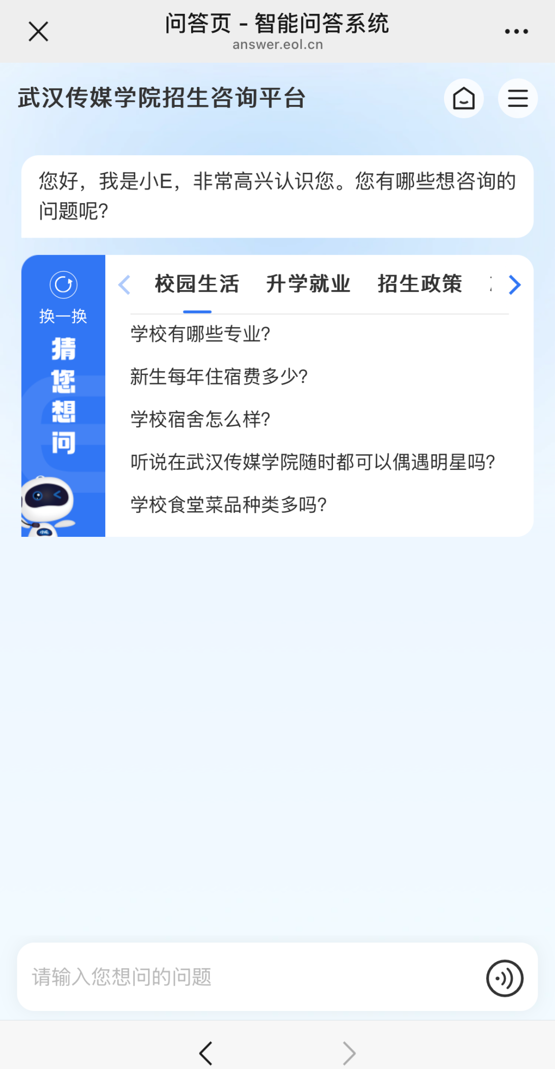 关注后可进入到“武汉传媒学院”微信公众号主页,点击底栏菜单栏“招生”的“智能问答”即可在线咨询。移动端招生咨询平台问答页同时支持语音提问。