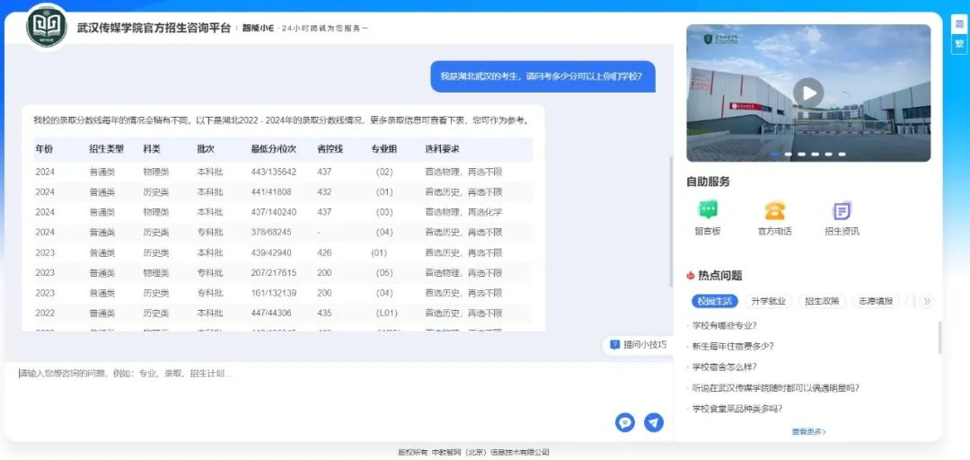 当你问“我是湖北武汉的考生,请问考多少分可以上你们学校?”时,系统不仅能通过DeepSeek大模型技术精准识别你的咨询意图是:省份、分数、选科要求、录取分数,还会结合历年录取数据,为你提供精准的回复!2