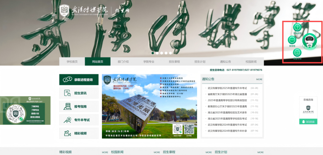 各位学子及家长可通过武汉传媒学院招生官网和微信公众号两种方式进行在线咨询。方式一:学校招生官网登录武汉传媒学院招生网https://zsw.whmc.edu.cn/点击右侧“智能机器人小E”,在登录界面完善基础信息后即可在线咨询或留言。(操作详情见下图)