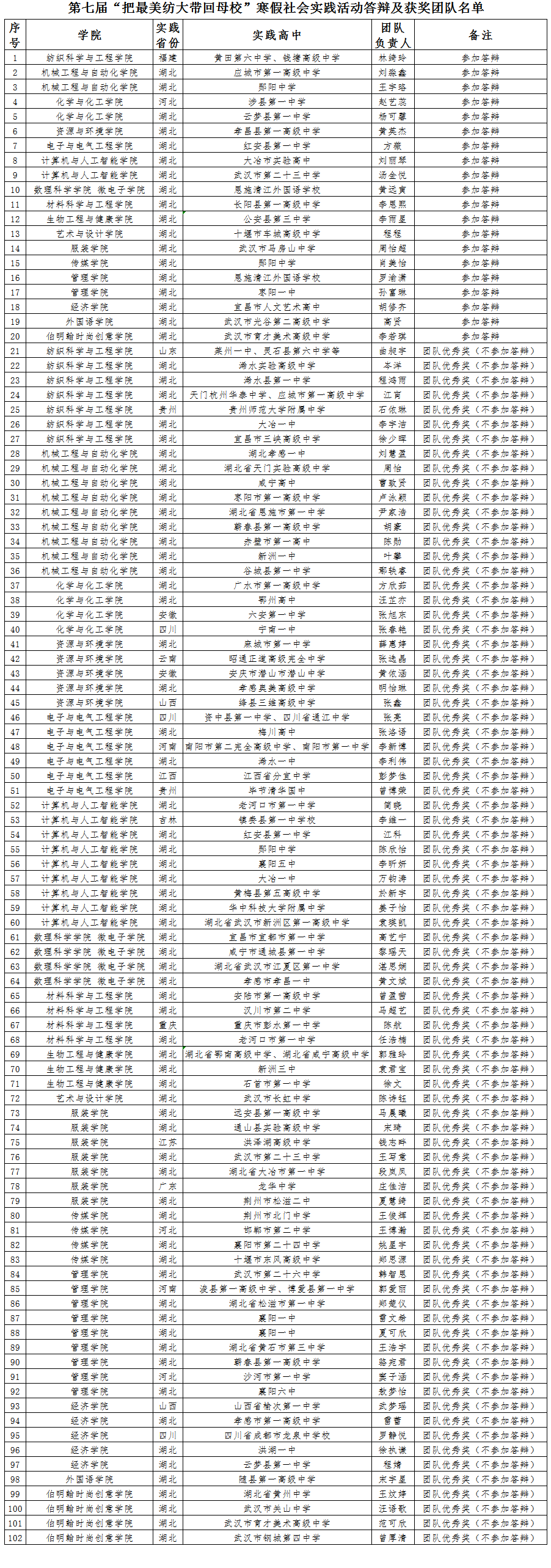根据《关于开展第七届“把最美纺大带回母校”寒假社会实践活动的通知》要求,为总结交流此次寒假社会实践工作开展情况,结合各实践团队活动完成情况,经各学院团委组织初评,共确定102支实践团队获奖,其中20支团队参加本次公开答辩竞评团队一、二、三等奖,其余82支团队荣获团队优秀奖,不参加答辩。详细获奖名单及答辩安排如下: